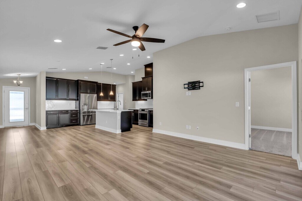 Beautiful open floor plan, 3-bedroom, 2-bath, 2-Car garage villa, a low maintenance home. Featuring impressive high ceilings, custom lighting, luxury vinyl plank flooring in the main living area. The roomy comfortable living room offering triple sliding doors, that open to a beautiful, covered screen lanai. A great place to have morning coffee, lunch or that cocktail with friends in the evening. A additional side enclosed screen patio greets you at the entrance of the home. The functional kitchen offers a center island with dual seating, all appliances, Sonoma Linen Cabinets, Calcutta Novella Quartz countertops and just steps to the Dining Room. The luxury Master bedroom with its sizable walk-in closet and a master bathroom featuring dual vanities, quartz countertops, and a floor-to-ceiling tiled shower. The three bedroom two bath home is complete with washer and dryer, in a large laundry room.