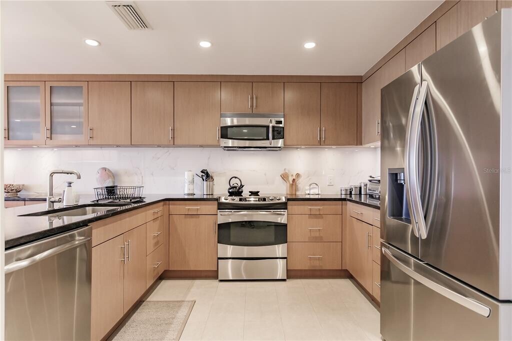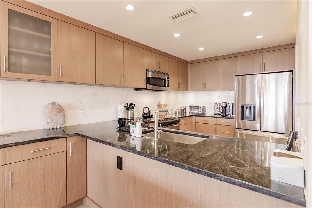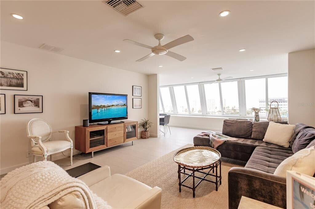 This property is a 30 night minimum. This stunning,updated 2 bedroom,2 bath is located in a bay-side mid-rise unit and is approximately 75 yards from the bay. The master bedroom has a king bed,a TV,and pocket sliding glass doors that gives access to the extended lanai living. The master bathroom has a walk-in glass door shower with grab bars and a beautiful granite vanity. The guest bedroom has a Murphy bed,a TV,a couch,a keyboard,and an in window retreat area to enjoy the view or a book. The guest bathroom has a shower. The kitchen has updated stainless steel appliances,counters,cabinetry,and recessed lighting. This open concept unit allows for cooking and entertainment to flow seamlessly with the kitchen connecting to the dining and living area. The modern dining table has service for 6 and updated lighting. The living room offers a stylish and comfortable retreat after the long day,with attractive seating,a large TV,and pocket sliding doors allowing seamless access to the extended living lanai. The living room has an EXTRA large Queen pull out sleeper sofa. The lanai has been transformed into a second living space with an additional dining area,a bold but cozy couch,ceiling fans,and a stunning view of the gulf,gardens,and Peppertree Bay. There is also a work space available in the lanai. This unit has an assigned parking garage spot under the building and an in-unit washer and dryer. This unit is accessible by elevator or stairs. MLS# TB8470232