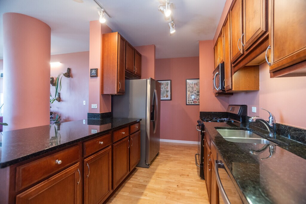 Welcome to this east-facing top-floor 1 bedroom, 1 bathroom with beautiful views of Lake Michigan. The large open living area features laminate wood flooring, while the spacious bedroom offers plenty of room to relax. The kitchen is both functional and elegant, with 42" cherry cabinets, granite countertops, and a peninsula perfect for casual dining or entertaining. You'll also enjoy the convenience of in-unit laundry, a private balcony, garage parking, and an extra storage cage-all included in the rent. Located just steps from the Roosevelt El (Red, Green, and Orange lines), Trader Joe's, Jewel, Mariano's, Target, Starbucks, parks, and world-class museums-this location truly can't be beat. Rent includes everything except electric, and the full-amenity building offers 24-hour door staff, on-site management, and a newly renovated fitness center with recently updated equipment. Listing courtesy of: Dream Town Real Estate