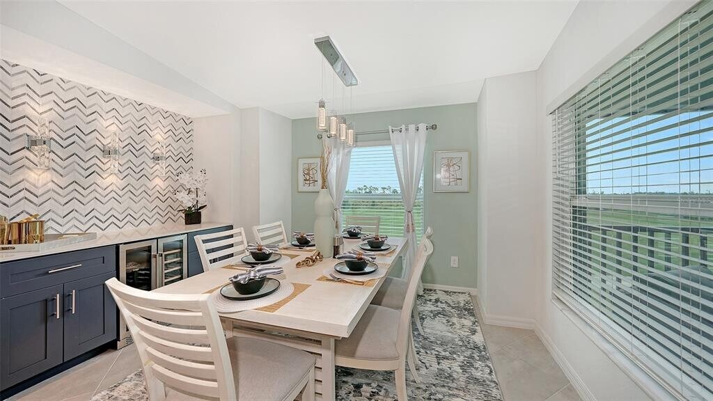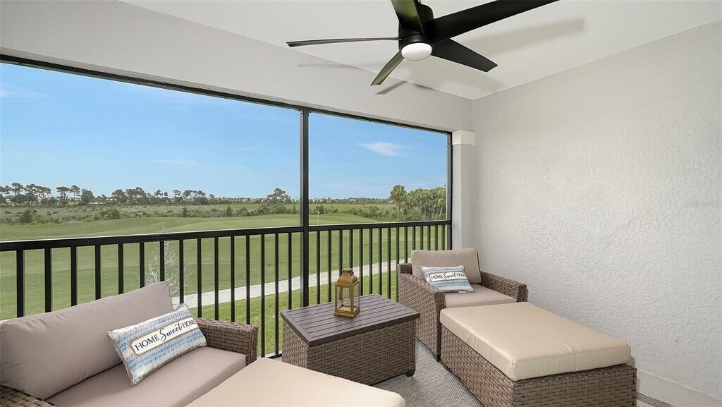 Stunning second floor 2-bedroom 2-bathroom condo with a den has stunning view of the fairway! This turnkey property has been professionally decorated with chic modern flair and upgrades galore which include a custom back splash and a built-in bar with wine refrigerator and upgraded lighting. Enjoy gorgeous sunny days and cross breezes on your very own front and back lanai. Functional open floor plan lends itself to Florida style living and entertaining. Nicely appointed kitchen boasts stainless steel appliances and granite counter tops. Master has king size bed and ensuite bathroom with double sinks and large tile walk in shower. Plenty of room for guests and family. Queen bed in the second bedroom. Third flex room has a pull-out sofa with a desk for additional sleeping quarters or working space. Separate detached 1 car garage for your car,golf clubs and beach gear. Entertain guests and enjoy meals as you watch the golfers navigate this new 18-hole Gordon Lewis designed course from your very own lanai! Amenities include TIKI BAR/RESTAURANT,FITNESS CENTER,RESORT STYLE SWIMMING POOL,POOLSIDE SERVICE,THREE SATELLITE POOLS,TENNIS COURTS,PICKLE BALL,BOCCE BALL AND MORE! Golf membership transfer available for purchase. $65.00 monthly minimum expenditure is required at the on-site Tiki- Bar/Restaurant (Alcohol Excluded). Easy access to I-75,downtown Wellen Park,Atlanta Braves Training stadium and local shopping and dining,minutes to Gulf Beaches and all Wellen Park has to offer. ***HIGH SEASON (DEC-APRIL) RATE~ $6,500.00 PER MONTH*** LOW SEASON (MAY-NOV.) MLS# A4616319