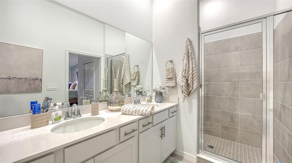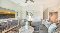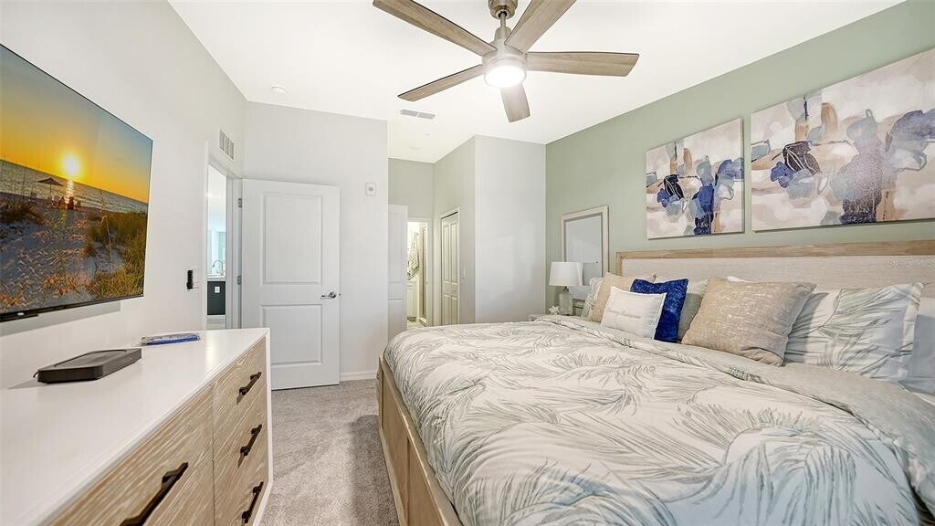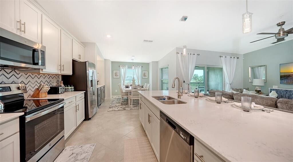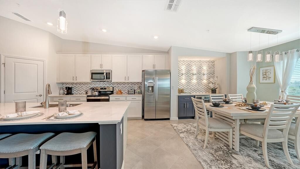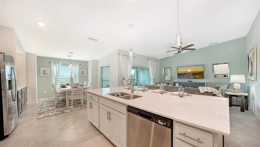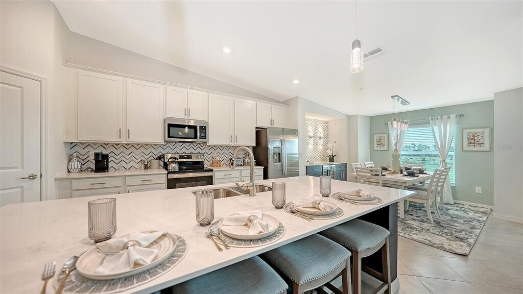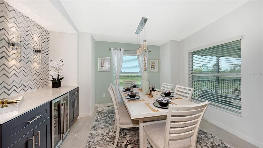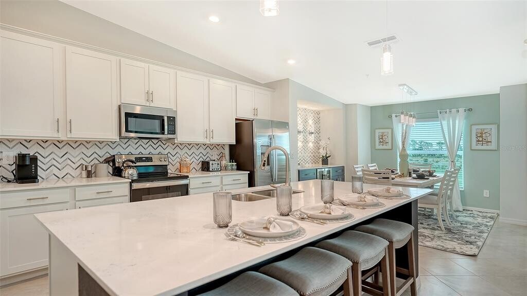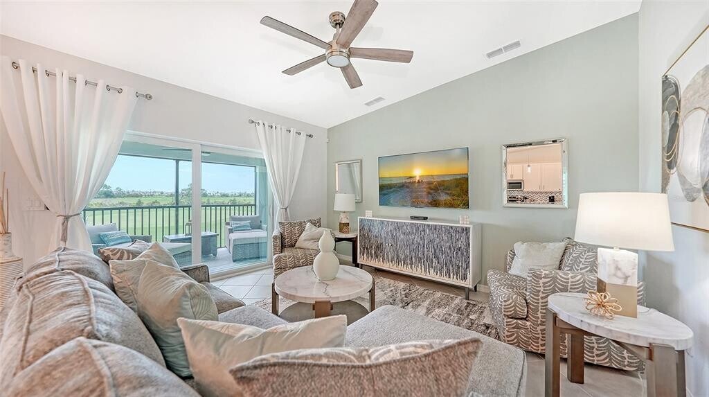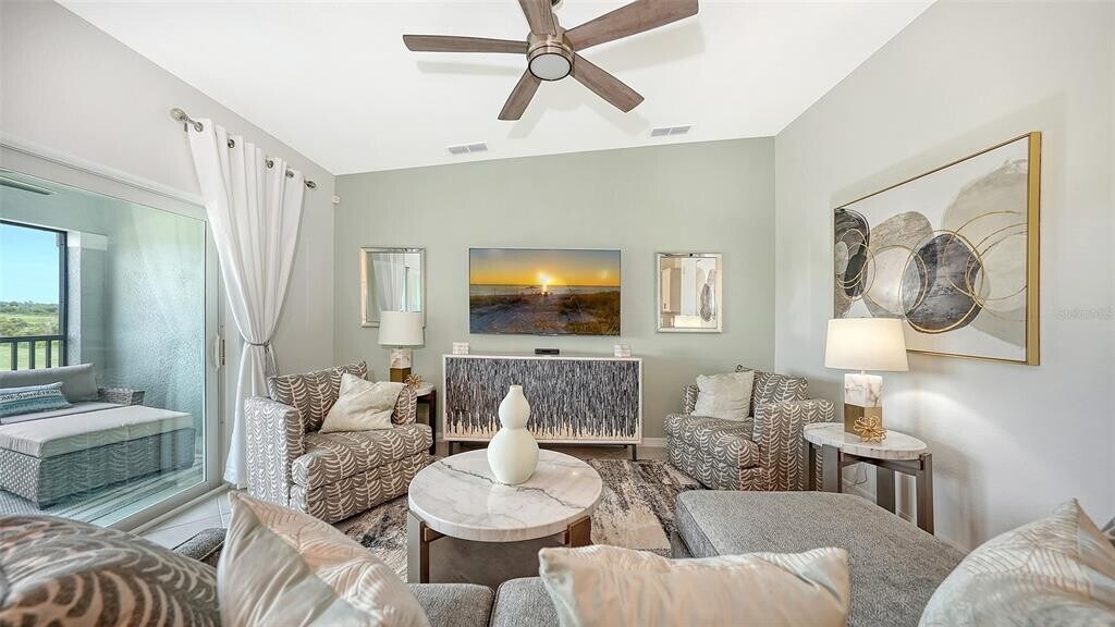 Beautiful brand-new 2- bedroom,2-bathroom first floor Veranda offers chic coastal furnishings in soothing color palette,upgraded lighting,ceiling fans and kitchen backsplash. Stunning fairway and preserve views greet you as you enter the condo which is located within the sought after gated community of Wellen Park Golf and Country club. This newly decorated,condo features 1,680 square feet of well thought out living space and features a screened in front and rear lanai for enjoying gorgeous sunny days and cross breezes and entertaining guests. Master suite boasts walk in closets,en-suite bath with double sinks and large walk-in shower. Second bedroom and den share a full size second bathroom with bathtub/shower combo,quartz countertops and vanity. Nicely appointed kitchen features large island,quartz counter tops,wood cabinets and stainless-steel appliances with functional pantry that shares space with living and dining areas. Dining room offers upgraded wet bar with wine refrigerator. This clever floor plan features den with pocket doors,offering a multi-functional space for additional guest quarters or office/working space. A detached one car garage is located conveniently in front of the condominium and offers easy access,just steps from the front door of this ground floor unit. All bedrooms have a television as well as the living room and lanai. King bed in master,queen bed in second bedroom and pull- out sofa in the den. Hurricane impact resistant windows and doors are featured. Take your love of the game to the next level on the newest Gordon Lewis championship golf course. Property is being offered with golf membership as well as access to resort style amenities such as main resort style pool,3 satellite pools,fitness center,tiki bar,pickle ball,tennis courts,bocce ball and a dog park. This community is located in close proximity to downtown Wellen Park,which offers an array of shops,music events,restaurants,lake,walking trails,kayak and paddle board rentals,farmers market,and more. Nearby Gulf beaches,downtown Venice and Atlanta Braves spring training facility. ***HIGH SEASON (DEC-APRIL) RATE~ $6,500.00 PER MONTH*** LOW SEASON (MAY-NOV.) RATE~ 2,500.00*** Immediate occupancy. MLS# A4622432