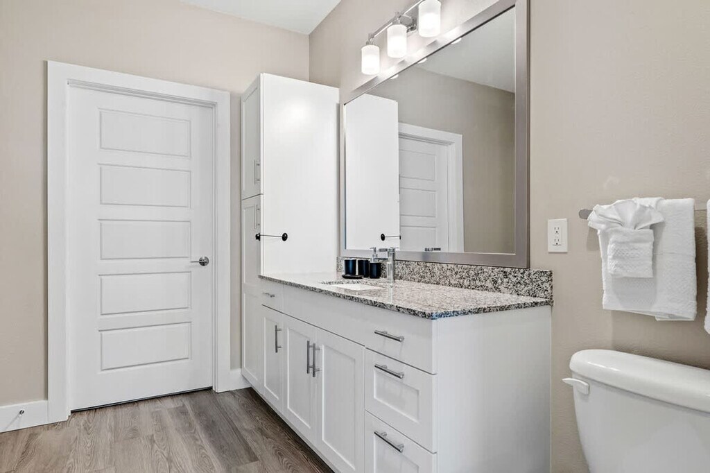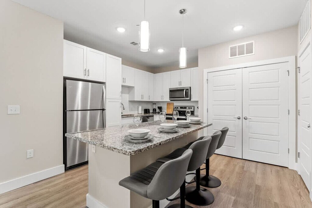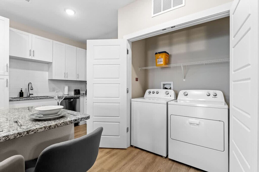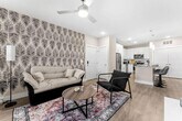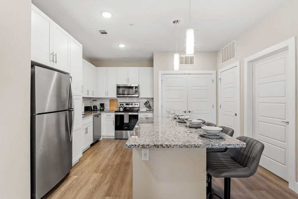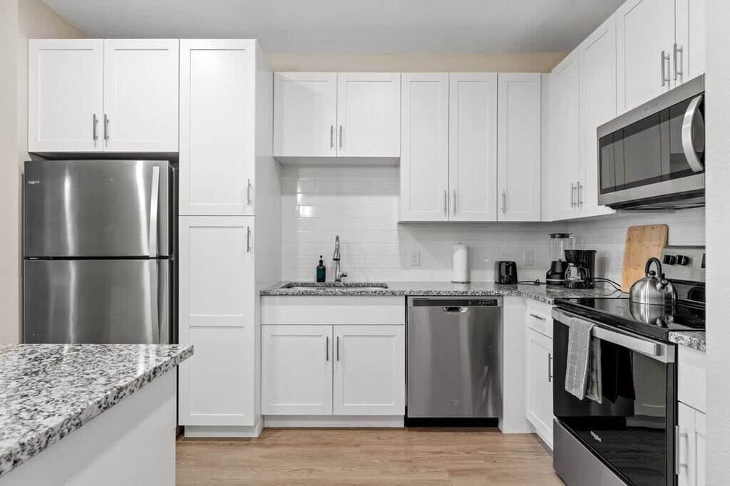 Feel at home in this modern 1-bedroom, 1-bathroom apartment in Orlando. This chic and cozy apartment offers the ideal base for your Florida adventure, combining comfort with convenience and featuring easy access to nearby theme parks, shopping, and dining options. The apartment features a bright and airy living space with ceiling fans in both the living room and bedroom, an open floor plan with upgraded flooring and stylish tile accents, and a screened-in patio. The living room includes a queen-size sofa bed, accommodating 2 additional guests, and a flat-screen 50” TV. The fully equipped kitchen features energy-efficient stainless steel appliances, sleek granite countertops, a refrigerator, stove, microwave, coffee maker, blender, toaster, cookware, and utensils. The spacious bedroom offers a king-size bed with premium linens, a large walk-in closet with iron and ironing board, a ceiling fan, and a 43” flat-screen TV. The full bathroom includes a spacious bathtub and essential amenities: toilet paper, shampoo, conditioner, shower gel, hand soap, towels, and hairdryer. Luggage drop-off is available after 12:30 PM with advance notification. Pets are welcome, however upon making the reservation you have to provide a scan or photo of the up-to-date dog vaccination, rabies shot, and general basic info about the dog. Make sure to add your pets in the reservations and the pet fee will automatically apply to your total. Enjoy the pool, stay active in the gym, or explore nearby attractions like Disney. This apartment is close to shopping, dining, and major Central Florida hotspots. Quiet hours are between 10:00 PM and 8:00 AM. Breed restrictions apply to pets: Pit Bull Terriers, Staffordshire Terriers, Rottweilers, Doberman Pinschers, Chows, Presa Canarios, Akitas, Alaskan Malamutes, and Wolf-Hybrids.