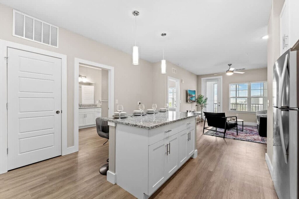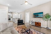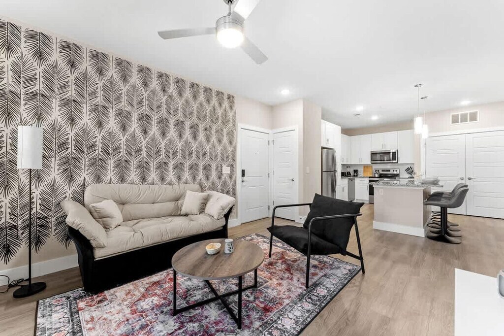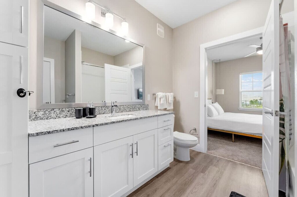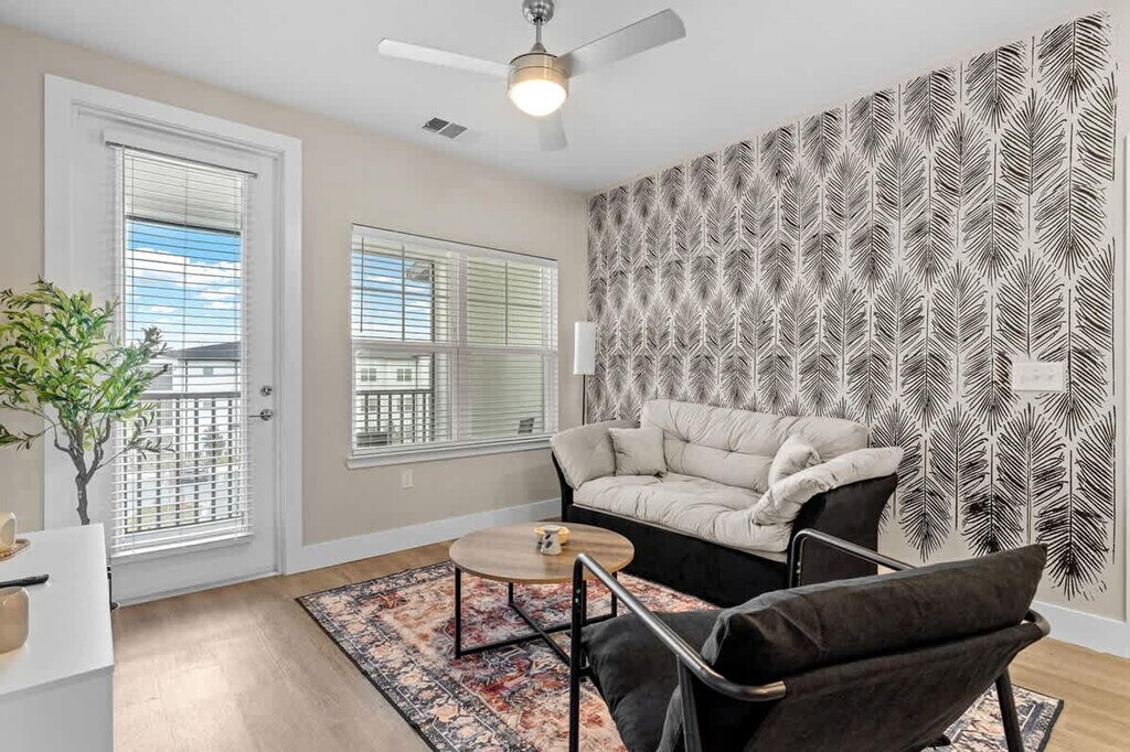 Feel at home in this modern 1-bedroom, 1-bathroom apartment in Orlando. Located on the third floor of a building without an elevator, but accessible via two ramps of stairs, this chic and cozy apartment offers the ideal base for your Florida adventure. This apartment features a bright and airy living space with ceiling fans in both the living room and bedroom, an open floor plan with upgraded flooring and stylish tile accents, and a screened-in patio. The fully equipped kitchen includes energy-efficient stainless steel appliances, sleek granite countertops, a refrigerator, stove, microwave, coffee maker, blender, toaster, cookware, and utensils. The spacious bedroom offers a king-size bed with premium linens, a large walk-in closet with an iron and ironing board, a ceiling fan, and a 43” flat-screen TV. The full bathroom has a spacious bathtub and essential amenities: toilet paper, shampoo, conditioner, shower gel, hand soap, towels, and a hairdryer. Pets are welcome, but some breed restrictions apply: Pit Bull Terriers, Staffordshire Terriers, Rottweilers, Doberman Pinschers, Chows, Presa Canarios, Akitas, Alaskan Malamutes, and Wolf-Hybrids. A Pack 'n Play crib with a crib sheet and blanket (no pillow) is also available. Enjoy easy access to nearby theme parks, shopping, and dining options. Relax with resort-style amenities in the charming community and explore major Central Florida hotspots. Quiet hours are between 10:00 PM and 8:00 AM.