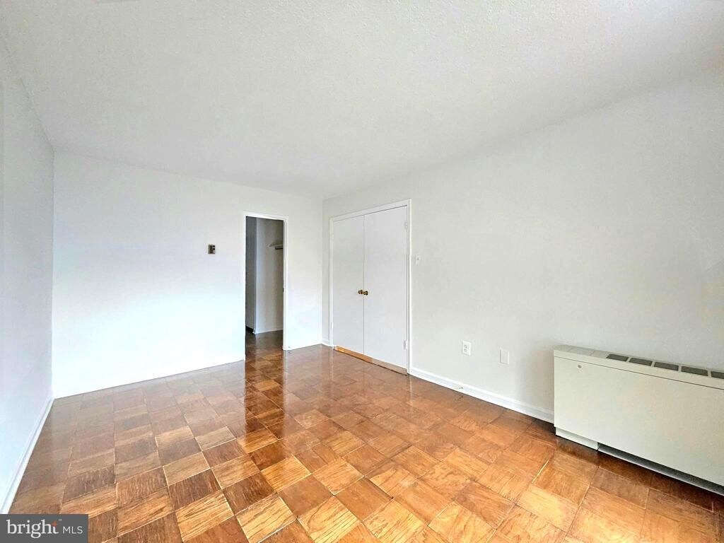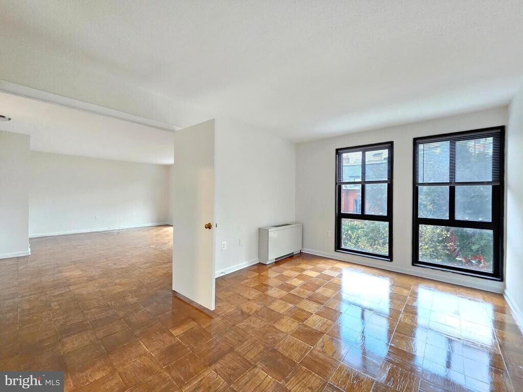 A Rare Blend of Comfort and Convenience. Unit 402 at the St. George Condominium is a large and bright one-bedroom, one-bath home on the north side of the building in Dupont Circle, featuring floor-to-ceiling windows with tree-canopy views, an open layout with parquet floors, and a modern bathroom accessible from both the bedroom and entry hall. The bedroom accommodates a king bed and includes a walk-in closet, and the living area offers built-in shelving for additional storage. Utilities are included. An optional parking space is available in the building for an additional $250. Building amenities include daily concierge service, a scenic rooftop terrace. Two nearby Metro stations, Whole Foods, Trader Joe’s, and Tatte Bakery are within walking distance.