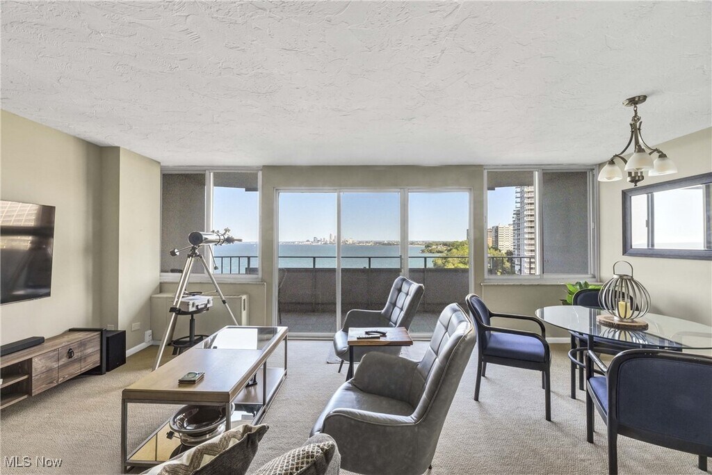 #1605 - Fresh and pretty furnished one bedroom with fantastic downtown skyline and Lake Erie water views from your private balcony. Nicely updated kitchen with kitchen featuring newer appliances and ceramic tile. Luxury vinyl plank flooring throughout Living Room,Dining Room and Hallway. Bedroom is carpeted. One heated garage space included. The Carlyle features a full complement of amenities including 24/7 reception/security/management,indoor and outdoor swimming pools,sauna,hot tub,two party rooms,fitness center,billiards/ping pong,laundry center,Boardwalk Market Deli,Summer Place Restaurant and more!