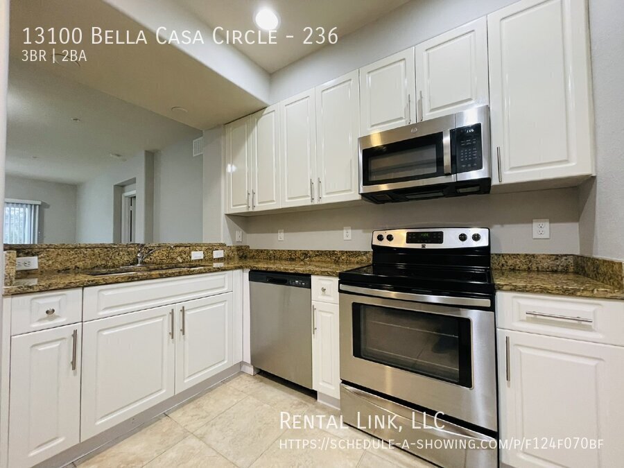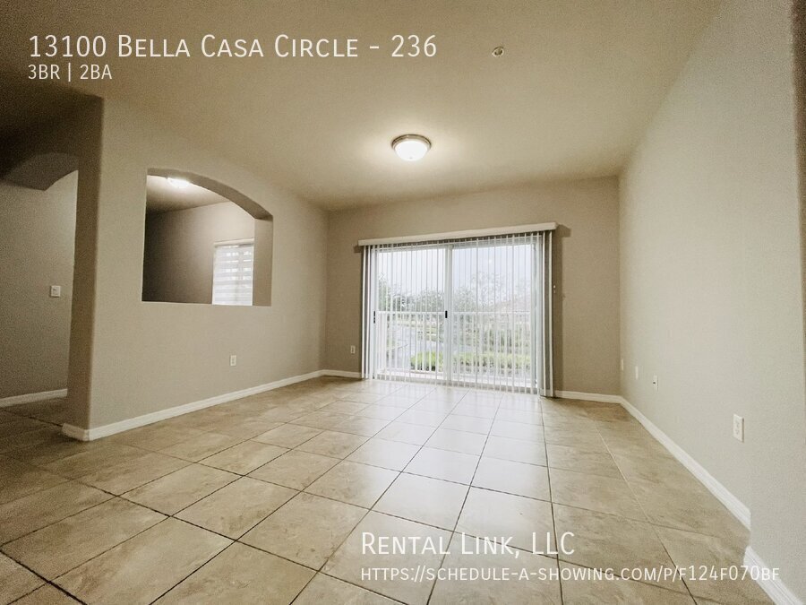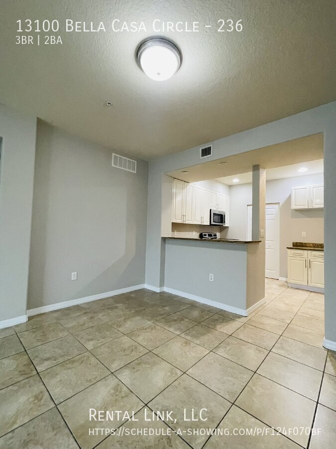 This three bedroom, two bathroom condo offers 1,394 square feet of well laid out living space within the Bella Casa community. The interior features tile flooring throughout, giving the home a clean, cohesive look while also making everyday maintenance simple. The open living and dining area connects directly to the kitchen, creating a functional layout that works just as well for relaxing at home as it does for casual gatherings. Each bedroom is generously sized with ample closet space, and the primary suite includes a private bathroom for added comfort. A full size washer and dryer are conveniently located inside the condo, keeping laundry day straightforward and efficient. Bella Casa offers residents a variety of amenities designed for everyday enjoyment. The community features a resort-style swimming pool and spa, a well equipped fitness center, tennis courts, and a clubhouse available for resident use. Sidewalks and walking paths run throughout the property, and the grounds are well maintained, creating a pleasant setting whether you are heading out for a workout or winding down at the end of the day. This condo delivers a comfortable living space paired with amenities that add real value to daily life. All Rental Link residents are enrolled in the Resident Benefits Package (RBP) for $50.00/month which includes renters insurance, HVAC air filter delivery (for applicable properties), credit building to help boost your credit score with timely rent payments, $1M Identity Protection, move-in concierge service making utility connection and home service setup a breeze during your move-in, our best-in-class resident rewards program, and much more! More details upon application.