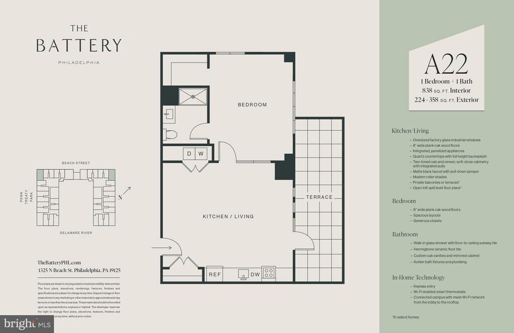 Michael PrinceCURRENTLY OFFERING 1 month FREE on a 13-month lease. Unmatched Urban Luxury with Iconic Views & Industrial Elegance- Welcome to an unparalleled living experience in this spectacular 1-bedroom, 1-bath luxury apartment spanning 659 square feet of meticulously crafted interiors and your very own "smokestack terrace" you have to see to believe.Bathed in natural light from oversized factory-style windows, the living and dining spaces boast 8 wide plank oak floors, offering a warm yet modern foundation. The chef-inspired kitchen is a masterpiece of design, featuring quartz countertops with a seamless full-height backsplash, custom two-toned oak and soft-close cabinetry with integrated pulls, and top-of-the-line stainless steel appliances. Every detail speaks to refined craftsmanship, from the matte black faucet with pull-down sprayer to the modern roller shades that perfectly complement the sleek, industrial aesthetic.Retreat to the spacious bedrooms, designed with both relaxation and function in mind. With generous closet space and an open layout, these rooms offer serene escapes from the city bustle. The primary suite boasts a spa-quality bathroom, complete with a walk-in glass shower, floor-to-ceiling subway tiles, and a custom oak vanity. Herringbone ceramic floors, bespoke mid-century sconces, and Kohler bath fixtures elevate the experience, blending timeless elegance with modern convenience.This residence goes beyond beauty, integrating cutting-edge technology for ultimate convenience. Keyless entry, smart thermostats, and a connected campus with seamless Wi-Fi from the lobby to the rooftop make every aspect of living effortless.Living here means access to a suite of exclusive amenities designed to enhance every aspect of your lifestyle. The rooftop offers four interconnected experiences, allowing you to soak in the vistas of the Delaware River and Philadelphia skyline. Whether you're working out in the state-of-the-art fitness center complete with basketball courts, rock climbing walls, and private studio space or unwinding at Pier 61, a riverside retreat with a concert barge, the possibilities are endless.Explore new culinary skills in the demonstration kitchen, host unforgettable gatherings in the resident bar, or lose yourself in a favorite book at the cozy library. Dedicated workspaces with open desks and plush lounge areas allow for deep focus and productivity without ever leaving home. (Photos are of model unit and may not match this specific unit)Exterior sqft: 306 sqft