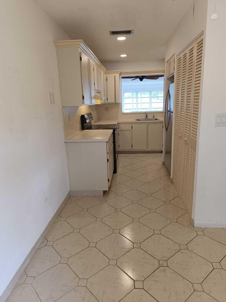 First floor condo in 55+ community of Palm Greens. Brand new kitchen cabinets and flooring. Large living room, dining room and master bedroom. Washer/Dryer. Screen in patio off LR and master bedroom overlookng green space.Palm Greens new millon $ clubhouse almost finished. Close to shopping, 15 minutes to downtown Delray and beach.