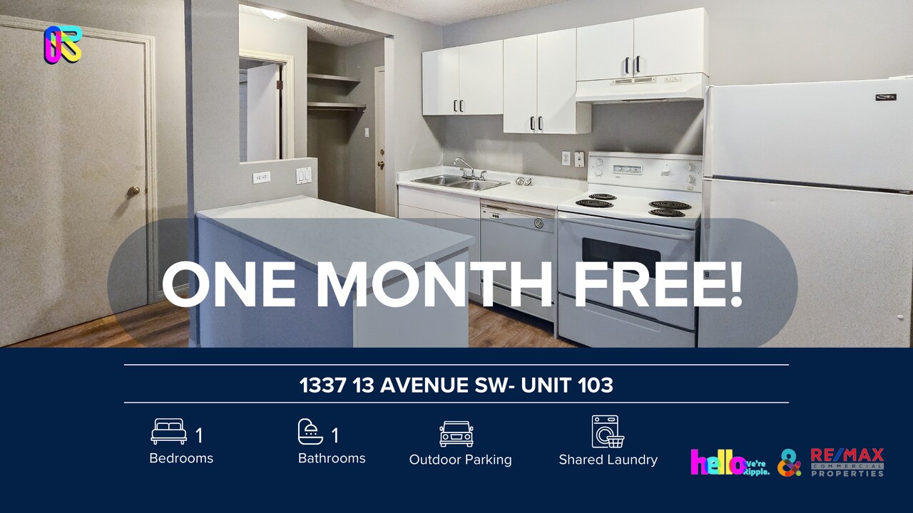NEWLY RENOVATED 1 Beds, 1 Baths Apartment/Condo | No Pets Allowed | ONE MONTH FREE for leases starting by Mar 1/26 Welcome to your new home at 1337 13 Avenue Southwest - 102 — a modern and well-maintained 1 beds / 1 baths / offering comfort, space, and convenience. Ideally located close to shopping, schools, parks, and transit. SHOWINGS: Conducted in an open-house format — book your appointment today! Prices, availability, and promotions are subject to change without notice. PROPERTY DETAILS: - Furnished or Unfurnished: Unfurnished - Utilities Included: Natural Gas & Water - Pets: No Pets Allowed - Smoking: Non- Smoking - Parking: Assigned Outdoor - Storage Included: No - Laundry: Shared Laundry - Management Type: Full Management - Lease Term: Long Term UNIT FEATURES: - Living Space:Open-concept living room layout, perfect for relaxing or entertaining - Kitchen: Sleek and modern kitchen with all appliances for a contemporary look with plenty cabinet storage to keep everything organized - Dining Space: Open-concept design flowing into the living space, perfect for entertaining - Bedrooms: 1 Bedroom featuring ample storage for clothing and accessories - Window Coverings: Includes window coverings for privacy and light control LOCATION HIGHLIGHTS: - Walk Score of 95+: Rated as a "Walker's Paradise," meaning almost all daily errands can be done on foot. - Prime Beltline Location: Situated between the 17th Avenue entertainment district and the downtown business core. - Transit Access: Within a 10-minute walk to both the Sunalta and 8th Street SW C-Train stations. - Recreational Proximity: Steps away from Barb Scott Park (Chinook Arc) and the 12th Avenue dedicated cycle track. - Retail Convenience: Close to major grocery stores like Safeway (8th St) and Co-op (11th St), plus various 17th Ave boutiques. ONE MONTH FREE offer: A special savings equal to one month's rent (maximum), spread evenly across your 12 month lease. For leases with initial term less than 12 months, the incentive will be prorated accordingly. Don't wait — properties like this don't last long.