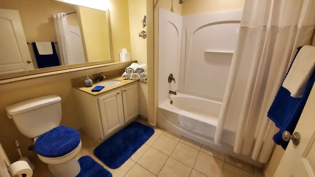 BEAUTIFUL CONDO ON GORGEOUS LAKE JUST MINUTES FROM DISNEY! MINIMUM STAY ONLY 5 DAYS! Beautifully decorated 2-bedroom + alcove (3rd bedroom), 4-bed condo just 10 minutes from Disney on a 214-acre lake. The private 25-foot balcony has a stunning view of the lake and sunrise, and a view of the Disney fireworks just outside your door. Amenities include 2 full baths, fully equipped kitchen, washer/dryer, high speed internet, gated entrance, free covered parking next to the elevators, and much much more! NOTE: We can host up to 4 adults and 2 children (there are 2 king beds and 2 child-sized beds). THE SPACE: Our facility also boasts 2 pools, a hot tub, and 2 workout rooms. The pool is heated to 82 degrees and it uses a salt filtration system instead of chlorine which is easier on the eyes. It is only one block (very short walk) to Starbucks, Subway, McDonald's, Chick-fil-A, and a Dollar store, and two blocks to Walgreens and restaurants. This condo is on the 6th floor near the elevators for easy access, so you won't have to climb stairs or pull your luggage up and down. The private balcony overlooks lake Bryan, a beautiful lake with wildlife and a boardwalk running through the trees and along the shore. Take a relaxing walk or curl up in the gazebo with a book or your laptop--you can plug into the outlet there and surf the internet via the wifi. If you plan to visit Disney it's preferable to have a car, but if not you can take an Uber or Lyft for only about $20; it's just a few minutes drive and they drop you off past the parking lots, saving you time, plus you don't have to pay the $30 Disney parking fee! This beautiful condo has recently been remodeled with new furniture and appliances. We know your stay here will be relaxing and full of wonderful memories! OTHER THINGS TO NOTE: Our condo is perfect for grandparents and their grandchildren, or up to 4 adults and 2 children. Please note that the third bedroom is an alcove with a bunkbed (2 beds on top of each other) which is only designed for children. See our photos which include a floor plan. We provide 2 days worth of soaps and detergents. If you need more, there is a dollar store with all kinds of supplies just one block's walk away next to the miniature golf course. TO VIEW THE CURRENT SCHEDULE AND BOOK THIS CONDO: All bookings and inquiries are handled exclusively through Airbnb. For pricing and current schedule, please visit our Airbnb site at: (If link does not show, go to Airbnb and search for listing #45286241)