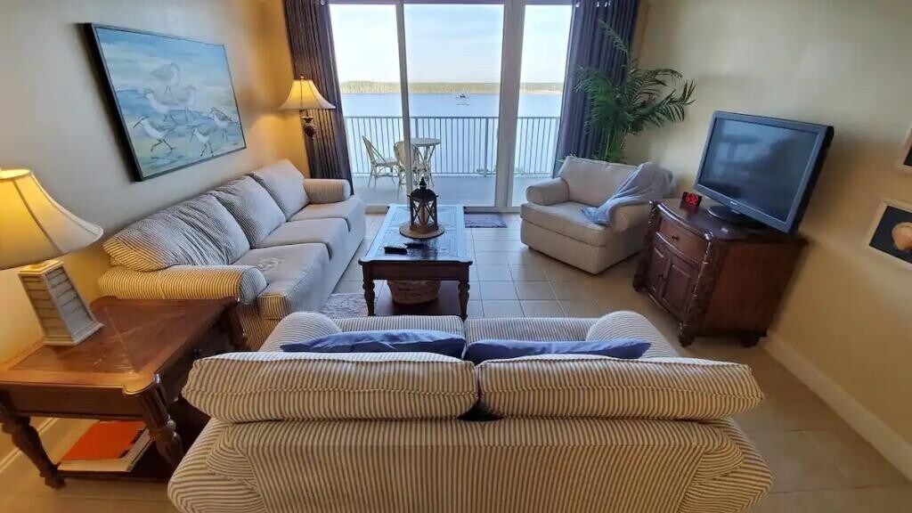 BEAUTIFUL CONDO ON GORGEOUS LAKE JUST MINUTES FROM DISNEY! Beautifully decorated 2-bedroom + alcove, 4-bed condo just 10 minutes from Disney on a 214-acre lake. The private 25-foot balcony has a stunning view of the lake and sunrise, and a view of the Disney fireworks just outside your door. Amenities include 2 full baths, fully equipped kitchen, washer/dryer, high speed internet, gated entrance, free covered parking next to the elevators, and much much more! NOTE: We can host up to 4 adults and 2 children (there are 2 king beds and 2 child-sized beds). THE SPACE: Our facility also boasts 2 pools, a hot tub, and a workout room. The pool is heated to 82 degrees and it uses a salt filtration system instead of chlorine which is easier on the eyes. It is only one block (very short walk) to Starbucks, Subway, McDonald's, Chick-fil-A, and a Dollar store, and two blocks to Walgreens and restaurants. This condo is on the 6th floor near the elevators for easy access, so you won't have to climb stairs or pull your luggage up and down. The private balcony overlooks lake Bryan, a beautiful lake with wildlife and a boardwalk running through the trees and along the shore. Take a relaxing walk or curl up in the gazebo with a book or your laptop--you can plug into the outlet there and surf the internet via the wifi. If you plan to visit Disney and don't have a car, shuttles are available (for a fee) to Disney, or better yet you can take an Uber or Lyft for only about $15; it's just a few minutes drive and they drop you off past the parking lots, saving you time, plus you don't have to pay the $30 Disney parking fee! This beautiful condo has recently been remodeled with new furniture and appliances, and it's the first time we are offering it through AirBnB. We know your stay here will be relaxing and full of wonderful memories! OTHER THINGS TO NOTE: Our condo is perfect for grandparents and their grandchildren, or up to 4 adults and 2 children. Please note that the third bedroom is an alcove with a bunkbed (2 beds on top of each other) which is only designed for children. See our photos which include a floor plan. We provide 2 days worth of soaps and detergents. If you need more, there is a dollar store with all kinds of supplies just one block's walk away next to the miniature golf course. TO VIEW THE CURRENT SCHEDULE AND BOOK THIS CONDO: All bookings and inquiries are handled exclusively through Airbnb. For pricing and current schedule, please visit our ad at the following URL and use the link at the bottom: propertymanage.biz/u41453/rentals/detail?p=516868