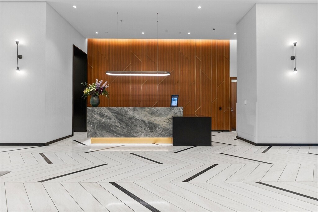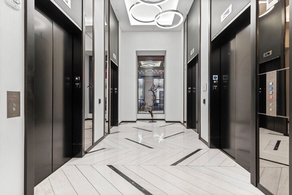 This luxurious residence offers refined city living on the 19th floor of Echelon Seaport. This stunning 2-bedroom,2-bathroom condo spans 1,168 square feet with an open floor plan ideal for relaxation and entertainment. Floor-to-ceiling windows in the living room,complemented by a tray ceiling,fill the space with natural light and frame captivating city views. The kitchen features a peninsula,custom Italian cabinetry,and Bosch appliances,flowing into the living room and private balcony overlooking the Grand Pool and Courtyard. The well-lit bedrooms and spa-like marble bathrooms add luxury.Residents enjoy one garage parking space and access to over 50,000 square feet of amenities,including indoor and outdoor pools,a fitness center with a basketball court,golf simulator,and yoga studio. Social spaces like a fireplace lounge,private dining room,and outdoor terraces enhance the experience. Services like 24/7 concierge and doorman ensure comfort and convenience. MLS# 73447201