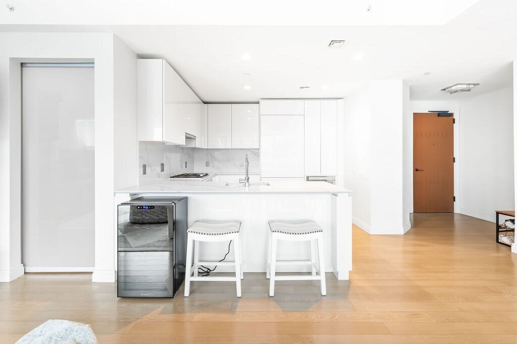 Echelon Seaport for rent. 1 bed, 1 Bath, 1 parking & 1 storage included. This unit offers two large closet, white marble bathroom with spacious walk-in shower, working area and rent included water/hot water, gas, electricity and parking. Hardwood floor throughout living/dining room , Electric roller shade and in-unit Washer/dryer. Modern open plan kitchen with custom Italia white panel cabinetry, Caesarstone quartz countertops, high end Bosch/Thermador integrated appliances, and white oak plank floors throughout. The marble-appointed bathroom contains a custom wood veneer floating vanity. Residents enjoy 24/7 service with 5-star hospitality provided by Regent Hotels & Resorts. Echelon has over 50,000 sq/ft of common space featuring owners lounge, roof terrace, 3 pools (1 indoor heated) with cabanas, fitness center, spa, indoor basketball court, golf simulator & terraces with fire pits. Steps to Courthouse Station (Silver lines), Trader Joe's Grocery store, restaurants, cinema and shops. No broker fees. No pet & no student.