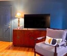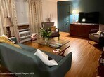 Fully furnished seasonal rental in desirable New Paltz. Spacious,well-appointed 2-bed first floor condo is tastefully decorated in an eclectic mid-century vibe,with authentic mid-century furnishings and artwork. Just bring your clothes and toiletries everything else is included! The living room is vast and boasts a genuine mid-century Nelson omni wall unit with an extensive library,bar,and display space for your items. It is furnished with a new and comfortable crate and barrel sofa,two overside comfortable chairs,a coffee table,and a credenza with a hidden compartment for items you want to be extra secure with and extra storage space. it also sports a DVD player and a 55-inch large-screen smart tv. The large windows provide a bright and sunny living space. There are two spacious bedrooms,each with a closet and storage space. Each bedroom has dressers and nightstands. The bedroom spaces will give you a beautiful and comfortable night's rest. There are duvets in each room; you can choose either an all-season down insert or a down alternative. We also supply the same choices with the pillows,down or down alternatives. There are quality percale sheets,duvet covers,and extra blankets. One bedroom has a Tempurpedic queen size bed,and the other has a pillow-top king bed. Blackout shades are provided. The spacious bathroom has a glass-enclosed tub,shower tower with spray jets,rain showers,and hand-held shower massager. It is well stocked with fluffy towels,mats,and ample storage. The dining room can easily fit four around the table or open it up for guests,and it will fit eight or more. There is a full kitchen with everything a cook could want open to the dining room and living room. It contains a large stainless steel refrigerator,dishwasher,and a four-burner range. There is a coffee pot,an expresso pot,a milk frother,an electric tea kettle: An instant pot,an air fryer,a crock pot,a pantry and so much more. There is a laundry room on the premises and an assigned parking space outside your door. This is seasonal but can be year round if needed.