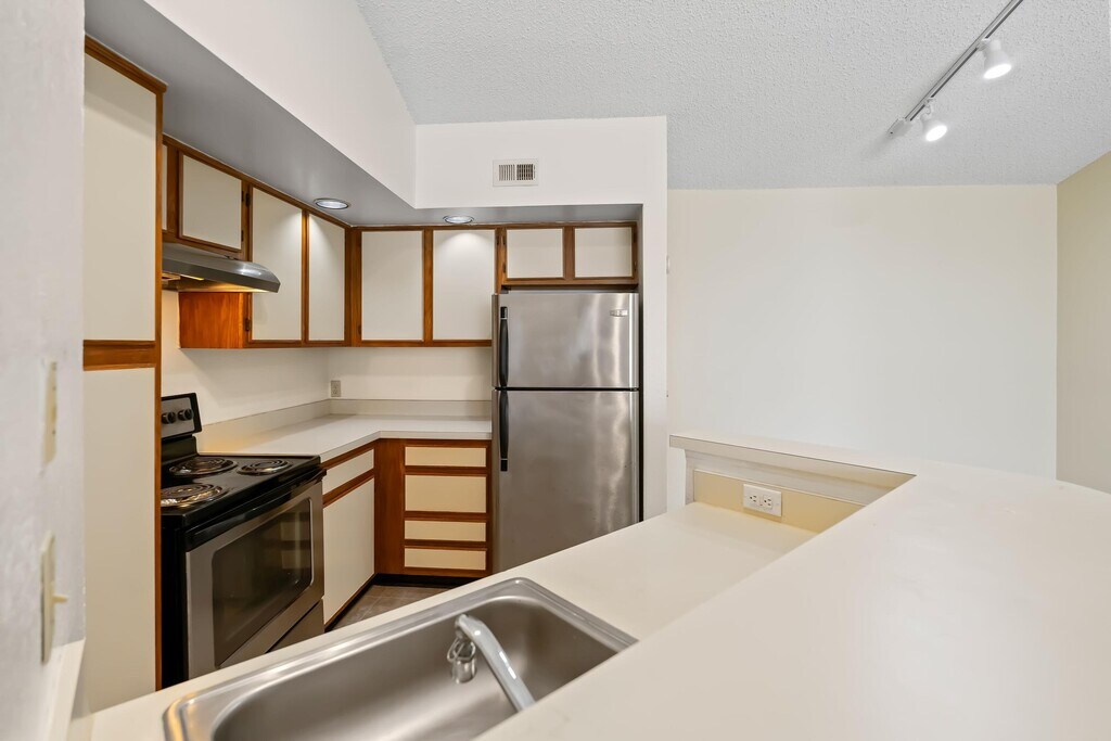 Renovated 2/2 with washer and dryer. wood cabinets in the kitchen with quartz counter tops. stainless steel appliances. Both bathrooms were renovated. The community has 2 pools and a gym. Must be approved by association.
