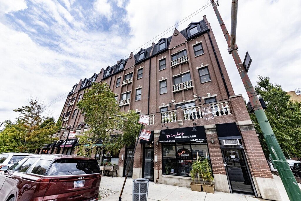 Bright and inviting 3rd floor unit in HOT West Town! The massive wall of windows fills the home with abundant natural light, showcases the dark hardwood floors, and highlights the spaciousness of the living room, dining room, and kitchen. Step up to the open kitchen which overlooks the living area, has a large island, stainless steel appliances, and good storage. The master suite is adorned with a delightful accent wall, balcony access walk-in closet, double vanity, and water closet. The second bedroom is good size and has large closet. North facing balcony is huge! 1 parking space included. Live right by Green Grocer and great lakes coffee, tons of restaurants and close to Grand Blue line, plus easy highway access!
