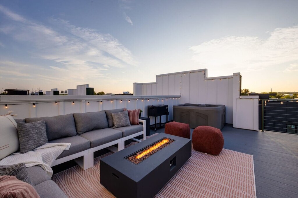 Welcome to The Wildflower, a vibrant Nashville escape. This beautifully designed four-bedroom, four-bathroom townhome blends modern comfort with thoughtful details, creating the perfect home base for your Music City adventure. Whether you're here for a group getaway, family vacation, or extended work-from-home stay, The Wildflower offers space, style, and convenience in one unforgettable setting. Gather in the open-concept living area, cook meals together in the fully stocked kitchen, and enjoy movie nights with smart TVs in every room. Head up to the rooftop patio to soak in the skyline views, unwind in the hot tub, or sip drinks under the stars. From start to finish, your stay at The Wildflower will feel both effortless and inspired. Things you'll love about this townhome include its location in the Cumberland Heights neighborhood, just minutes from Broadway. The rooftop offers skyline views, a hot tub, firepit, and lounge seating. Each bedroom features a private en-suite bathroom and smart TV. The modern, fully equipped kitchen and high-speed Wi-Fi ensure a comfortable stay. Chic décor thoughtfully curated by a talented local interior designer adds to the charm. Garage parking for two vehicles and additional street parking are available. The property is dog-friendly with a $150 pet fee per stay for up to two dogs, with no breed or weight restrictions. To further elevate your stay, a variety of experience add-ons are available, including early check-ins and late check-outs, private chefs, in-home massages, and in-home yoga sessions. Cumberland Heights is a vibrant neighborhood that is centrally located with easy access to all that Nashville has to offer. This area is ideal for those looking to explore the best the city has to offer while enjoying a comfortable and welcoming vibe. Dining options include Folk for upscale dining with a casual twist, Redheaded Stranger for Tex-Mex delights, and Renegade Coffee for expertly crafted espresso drinks. Local attractions like Topgolf and Nissan Stadium are just a stone's throw away. Whether you're here for the culinary delights, the exciting nightlife, or the myriad of attractions, Cumberland Heights is the perfect base for your Nashville adventure. Enjoy the close proximity to downtown while savoring the unique character and charm of this dynamic neighborhood. Commute times by car or Uber are convenient, with East Nashville just 3 minutes away, Downtown/Broadway 7 minutes, and Nissan Stadium 5 minutes. The home is located close to the highway, so noise is audible from the rooftop, and you may occasionally hear passing trucks from inside. This is a 4-story home, so be prepared to climb stairs. Quiet hours are from 10 p.m. to 8 a.m. Renters must be at least 21 years of age, and guests under the minimum age must be accompanied by a parent or legal guardian. The property shall not be used by more than the number of adults and children listed in your reservation. No smoking is permitted on the property at any time. There will be an additional cleaning fee of up to $500 for violations of the house rules or for excessive cleaning required. Hot tub rules include covering the hot tub when it's not in use and no glass in or around the hot tub. A $400 fee will be charged if glass or other substances are found in the hot tub. The Wildflower is perfect for an extended work-from-home stay, with high-speed Wi-Fi and smart TVs throughout the home, making it remote work-friendly. Registration Number: CASR