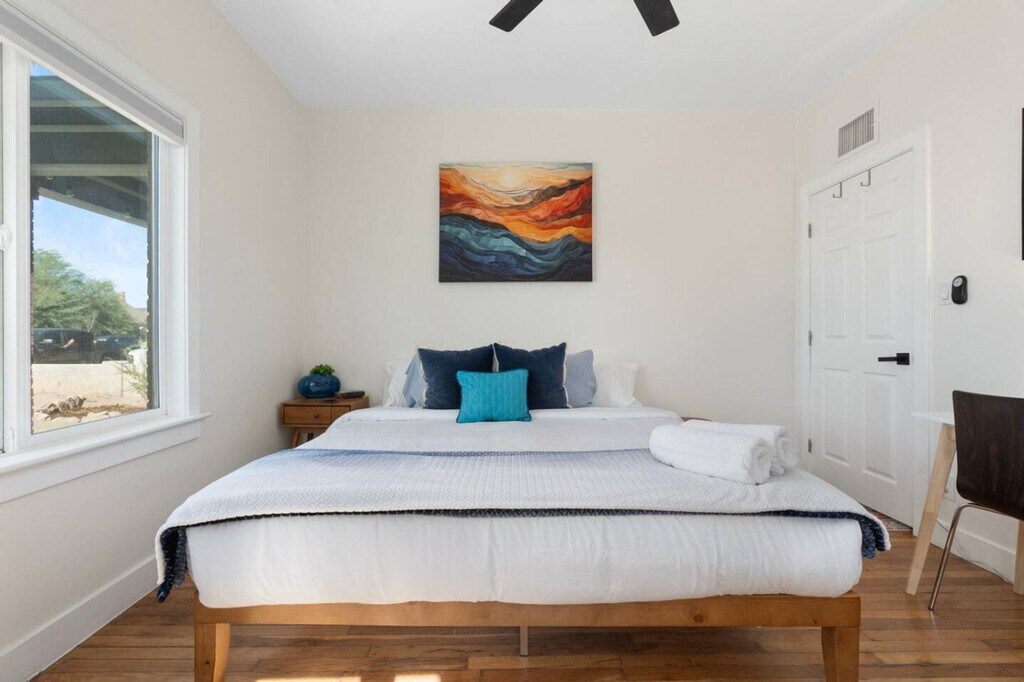 Chic 918 sq. ft. home in the Garfield Historic District of Downtown Phoenix! Modern updates meet cozy style with a fireplace, workspace, and vibrant design. Shared backyard and your own private space with fire pit and optional casita rental. Walk to Roosevelt Row, Phoenix Art Museum, Chase Field and more! Step inside and you’ll be greeted by a warm living area featuring a decorative brick fireplace, mid-century inspired furnishings, and a dedicated workspace for those who need to stay connected. Pops of color and unique design details bring personality and comfort throughout the home. The primary bedroom is bright and inviting, with a plush king-size bed, soft linens, and calming artwork that sets the tone for restful nights. The home also includes a fully equipped kitchen and modern bathroom to meet all your everyday needs. For larger groups, an additional casita on the property may be available to rent, perfect for extra privacy while staying together. Dogs and cats are allowed with approval and pet fee. Please ensure you are cleaning up after your pets, additional fines may occur for excessive clean up. The Aviary’s location puts you in the heart of it all. Stroll to Roosevelt Row for vibrant street art, galleries, and nightlife. Catch a game at Chase Field or a concert at Footprint Center. Explore cultural gems like the Phoenix Art Museum and Arizona Science Center, or take a short drive to the Phoenix Zoo and Desert Botanical Garden. Some of the city’s top-rated restaurants and coffee shops are just blocks away, making this home the ideal base for your downtown adventure. Guests will have full access to the main house in front. The casita is available for rent separately. Violating the guest policy will incur a $200 charge per person per day and possible cancellation of your booking. Any excessive cleaning required is $50 per hour. Tampering with security equipment is grounds for immediate cancellation of the booking. No smoking, vaping, or drug use is allowed, with a $500 fine for violations. No parties are allowed, and any breach will result in eviction without refund. Late checkouts can be arranged for an additional $100 fee and must be requested 24-48 hours in advance. A $150 charge applies to guests still on the property after check-out time. Cleaning crew will enter home at 11 AM to clean. Anyone still in the house two hours after checkout will then pay that day's base rate. If we have to refund another guest due to you staying in the property, you will reimburse us for any refunds given. Any damage resulting in blocking days off in the calendar will result in you paying the day's rate for however many days it took to restore the property. No crypto mining on premises, should it be found that this is happening you will be asked to leave and no refund issued. Be respectful of the neighbors. [SI]