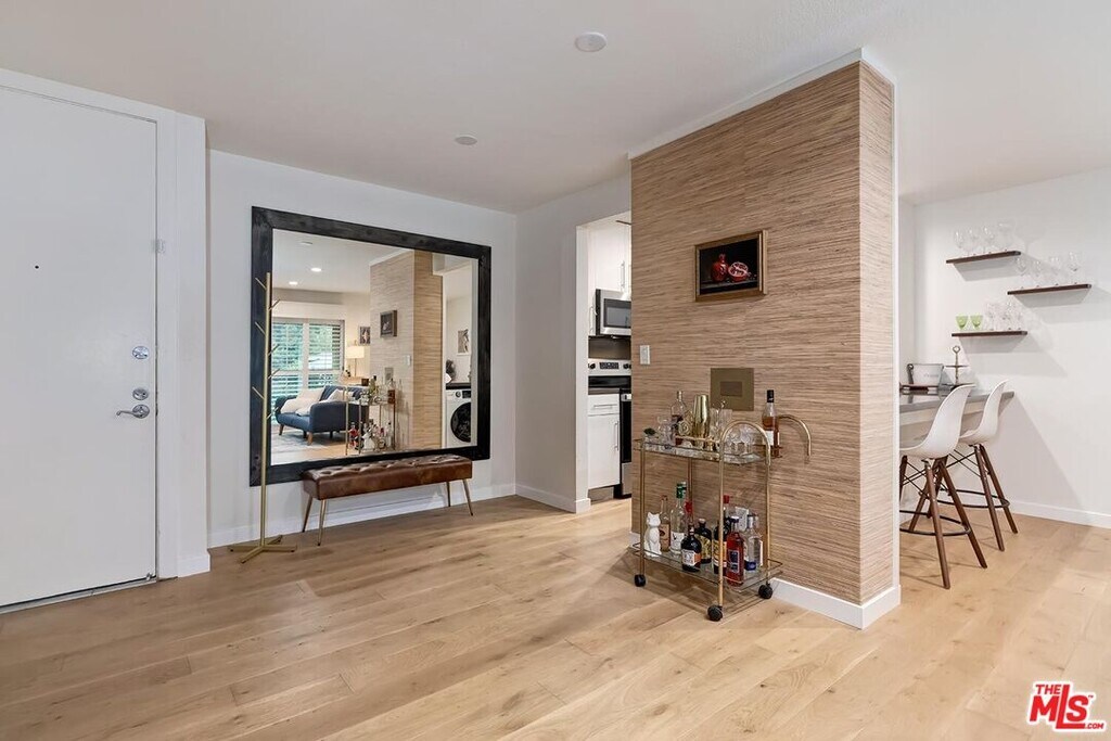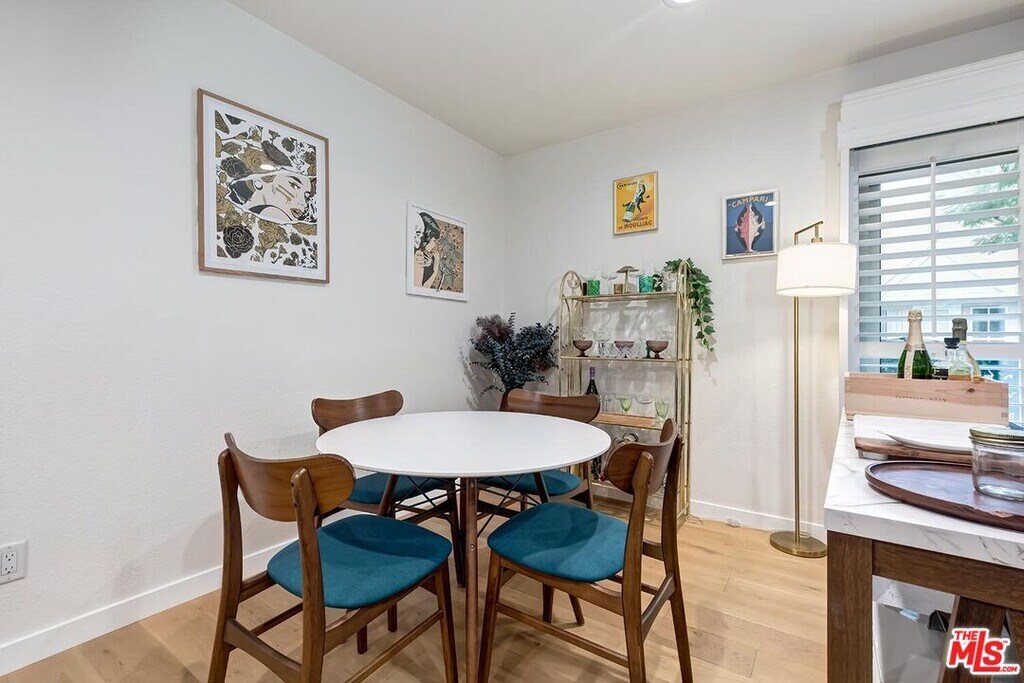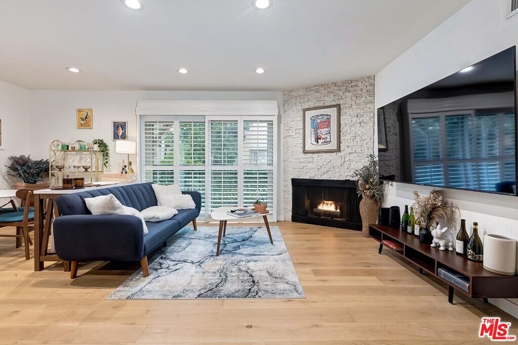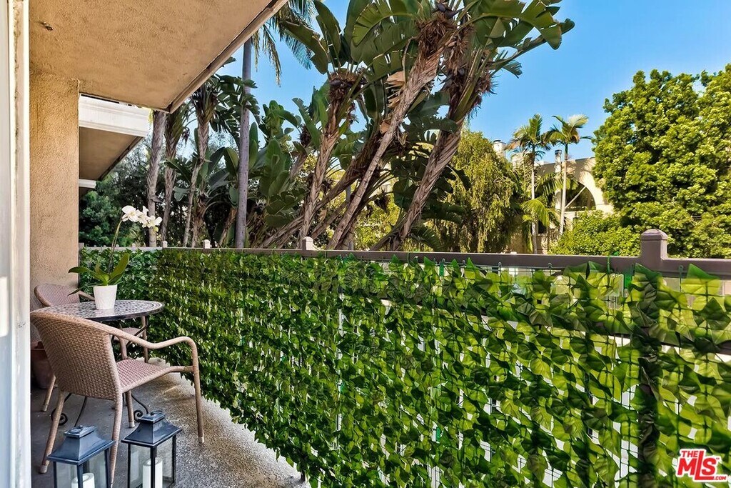 Designer Remodeled condo with incredible flow & views of treetops throughout. Centrally located sophisticated & modern building has state-of-the-art gym, resort-like pool, BBQ area w/outdoor dining & video controlled access. Bright & huge living & dining areas flow for roomy, comfortable everyday living & is ideal for entertaining. There is a huge breakfast bar opening to the updated kitchen, custom Seagrass wallpaper, white stone tiled fireplace & sliding door opening to the balcony, which looks out to the peaceful residential tree-lined street. Gracious primary ensuite has enormous custom walk-in closet + 2nd closet & wall to wall windows. Updated primary ensuite bathroom has thick Carrera Marble countertop. Updated 2nd full bathroom has custom banana leaf wallpaper, Carrera Marble countertop & rain showerhead. The spacious 2nd bedroom has tons of natural light & easy access to the hall bathroom. This unit has it all! In unit washer/dryer combo, central AC & heat, recessed lights w/dimmers throughout, double pane windows, new Vandyck hardwood flooring throughout, Plantation Shutters, Wainscoting, 2 parking spaces in secure garage, great storage & water & gas paid for by owner. Both bathrooms have Terrazzo tiled floors & glass tiled showers. Located in the heart of LA, blocks from Cedars-Sinai, hip shops, cafes & restaurants! Central location is close to Beverly Hills, the Westside & West Hollywood, making it ideal for LA living. Great opportunity to live in an updated & stylish unit, within a modern building with amenities, in one of the best & walkable neighborhoods in LA! MLS# 26652741