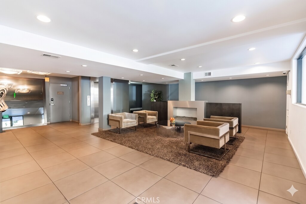 Move-In Special! Designer Remodeled condo with incredible flow & views of treetops throughout. Centrally located sophisticated & modern building has state-of-the-art gym, resort-like pool, BBQ area w/outdoor dining & video-controlled access. Bright & huge living & dining areas flow for roomy, comfortable everyday living & is ideal for entertaining. There is a huge breakfast bar opening to the updated kitchen, custom Seagrass wallpaper, white stone tiled fireplace & sliding door opening to the balcony, which looks out to the peaceful residential tree-lined street. Gracious primary ensuite has enormous custom walk-in closet + 2nd closet & wall to wall windows. Updated primary ensuite bathroom has thick Carrera Marble countertop. Updated 2nd full bathroom has custom banana leaf wallpaper, Carrera Marble countertop & rain showerhead. The spacious 2nd bedroom has tons of natural light & easy access to the hall bathroom. This approx. 1,000 sqft unit has it all! In unit washer/dryer combo, central AC & heat, recessed lights w/dimmers throughout, double pane windows, new Vandyck hardwood flooring throughout, Plantation Shutters, Wainscoting, 2 parking spaces in secure garage, great storage & water & gas paid for by owner. Both bathrooms have Terrazzo tiled floors & glass tiled showers. Located in the heart of LA, blocks from Cedars-Sinai, hip shops, cafes & restaurants! Central location is close to Beverly Hills, the Westside & West Hollywood, making it ideal for LA living. Great opportunity to live in an updated & stylish unit, within a modern building with amenities, in one of the best & walkable neighborhoods in LA! Rental Terms: Annual: $4,495 Per Month
