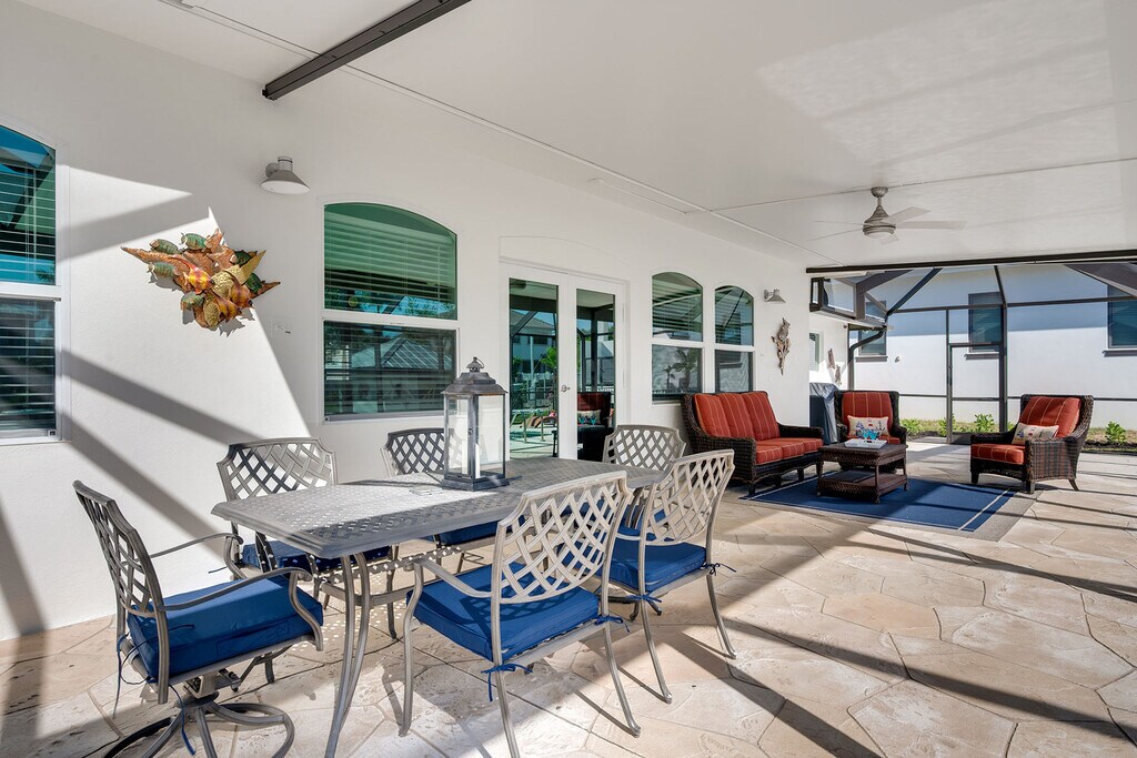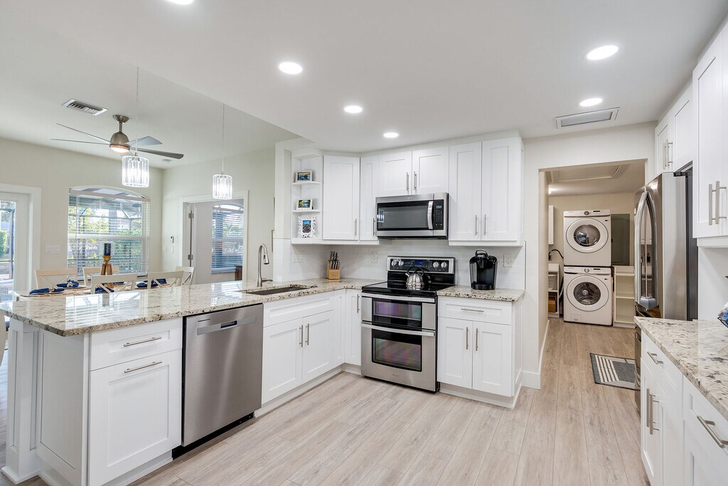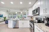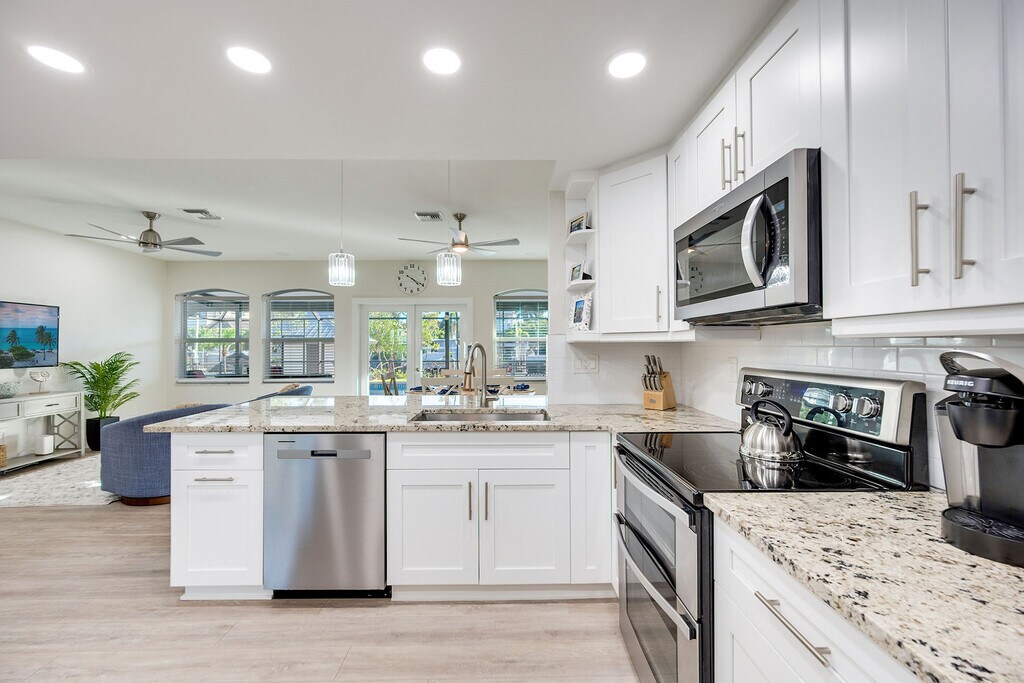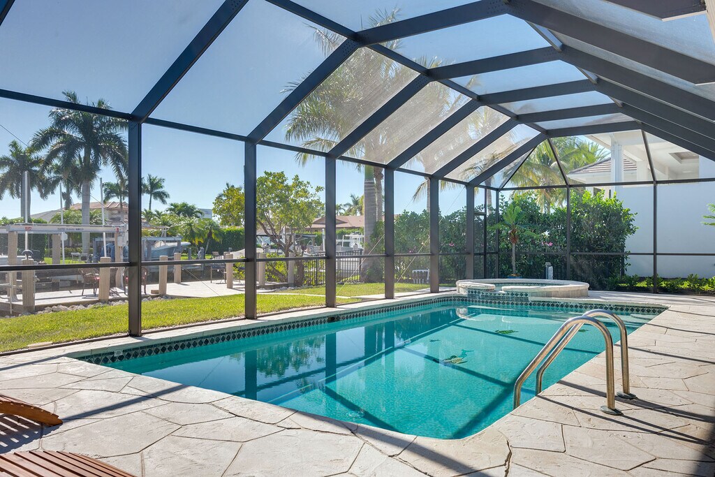This fully remodeled, WATERFRONT, PET-FRIENDLY, POOL HOME is available and located just 1/2 from Naples Bay Resort, a mile from 5th Avenue, and two miles from Naples' renowned beaches, you'll enjoy the same boating/fishing/biking lifestyle as the multi-million-dollar homes around you. The open floor plan features two separate living areas, each with a flat-screen TV, providing plenty of room to relax or entertain. The layout flows seamlessly into a dining area, breakfast bar, and a fully equipped, newly stocked kitchen. A dedicated bar area adds to the home's easy entertaining appeal. South-facing windows fill the interior with natural light and open to a large, screened pool deck—perfect for outdoor dining or lounging. The oversized heated pool and spa receive full afternoon sun in the winter, making the outdoor space enjoyable year-round. The home offers three bedrooms and three full baths. The primary suite includes a king bed, walk-in closet, and an en-suite bathroom with dual sinks and a walk-in shower. A second bedroom suite also features a king bed and full en-suite bath with a walk-in shower. The third bedroom offers flexible sleeping arrangements with two queen bunk beds and a twin trundle. There is a third full bathroom, also with a walk-in shower, conveniently located nearby. Additional features include a two-car garage with space for beach and boating gear, along with a circular driveway providing ample off-street parking. An easy WALK or BIKE ride to 5th Avenue and the beach, and a very short boat ride to Naples Bay, this waterfront access home is an exceptional Naples retreat. ALSO AVAILABLE ANNUALLY @ $9K monthly.