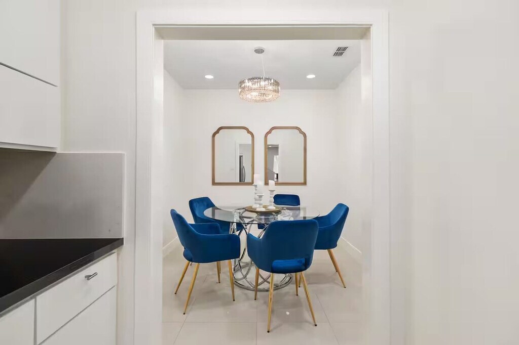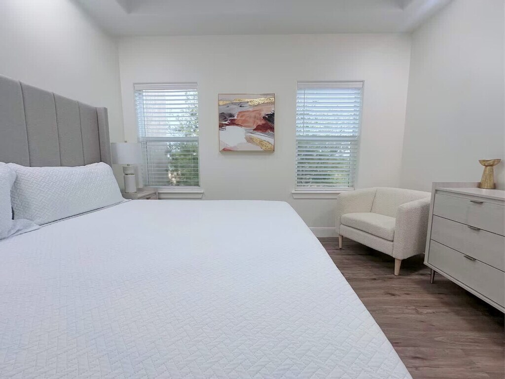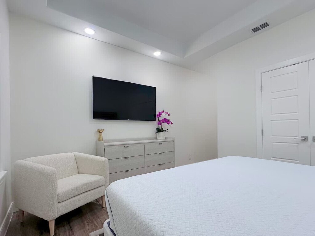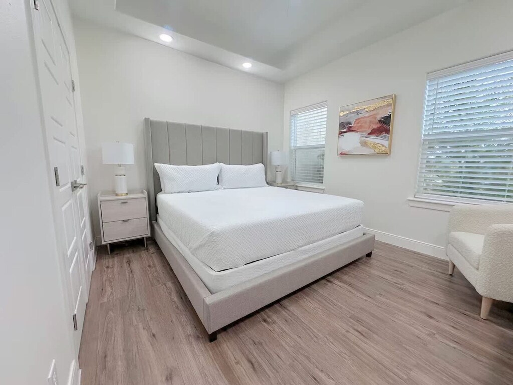 Step into your haven of comfort in this luxurious retreat, where sleek furnishings bask in natural light. Located in a gated community, this 2nd-floor apartment is accessed with a password. Unwind in the living area with a 70-inch TV and a chef-ready kitchen. The apartment is equipped with home appliances including a fridge, stove, oven, microwave, coffee machine, Keurig, dishwasher, washer, and dryer. Included amenities are towels, soap, shampoo, toilet paper, napkin roll, dish soap, and cleaning utensils. Mattresses have memory foam. Enjoy the pool amid lush greenery. This gated sanctuary includes a garage. High-speed unlimited Wi-Fi and 2 smart TVs are available. Located in the heart of the Rio Grande Valley, McAllen, Texas, is known for its vibrant culture, diverse community, and thriving economy. Situated near major highways and thoroughfares, 1413 Keeton Ave offers easy access to shopping centers, restaurants, entertainment venues, and medical facilities. McAllen prides itself on being a family-friendly city, with numerous parks, playgrounds, and recreational facilities nearby. The 78503 zip code reflects McAllen's rich cultural heritage, with a diverse population representing various backgrounds and traditions. Residents have access to a wide range of shopping and dining options, including malls, boutiques, supermarkets, and local eateries, offering everything from Tex-Mex cuisine to international flavors. McAllen is known for its low crime rate and commitment to public safety. The apartment has 1 room with a king-size bed and private bathroom and 1 room with 2 bunk beds (2 queen/2 twin) and private bathroom. An inflatable queen bed is also available. [SI]