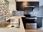 Completely renovated in the heart of Montrose. Spacious 1 bedroom 1 bath condo, upstairs corner unit. Beautiful water proof laminate flooring, plush designer carpet, SS appliances, mosaic tile backsplash, led lighting, updated fixtures & espresso cabinets. Spacious bedroom with 10 ft. wall to wall closet & additional walk-in closet in living room. Bathroom with tile & tub surround & 2 sinks with lots of storage space. All in one washer/dryer in unit & on site laundry room. 1 Assigned parking space. Balcony off dining room. Location!