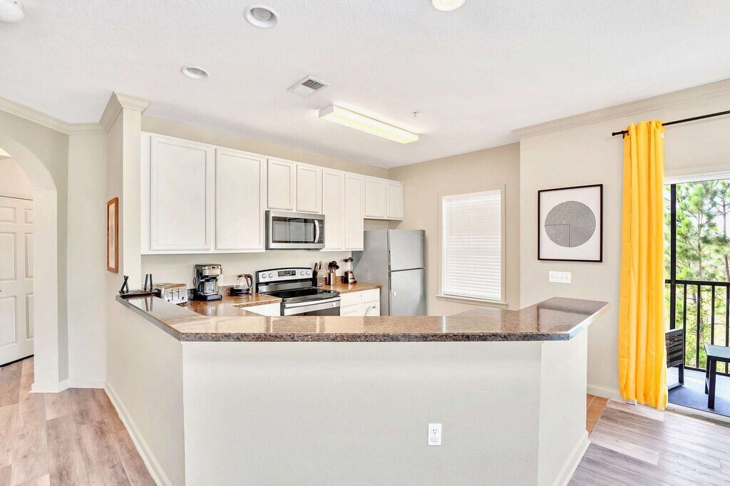 Escape to this modern and spacious 2-bedroom condo in Winter Garden, Florida, ideal for families or groups of up to 6 guests. Feel at home in this suite that features a king-size bedroom and a second bedroom with two queen beds. This pet-friendly condo features 2 en suite bathrooms, one with a soaker tub and separate shower and the other with a tub/shower combo. Enjoy Smart TVs in both bedrooms, high-speed internet, and central A/C. The fully equipped kitchen includes stainless steel appliances and granite countertops, along with an elevated breakfast bar and a spacious family dining area. There are also in-home laundry machines for added convenience. Enjoy complimentary parking. A "Pack 'N Play Crib" and a highchair are available for $40 each (one-time fee). Small dogs are welcome (maximum of 2) with a $99 pet fee per dog. You're perfectly positioned to explore the best of Central Florida. Walt Disney World is 5.7 miles away, Disney’s Animal Kingdom is 7.6 miles away, Hollywood Studios is 9.6 miles away, Epcot is 10 miles away, SeaWorld is 15 miles away, and Universal Studios is 19.8 miles away. Other nearby attractions include Orange Lake Golf Course (2.4 miles), Highlands Reserve Golf Club (6 miles), Lake Louisa State Park (11 miles), Camping World Stadium (26.7 miles), Orlando Science Center (30 miles), and Mennello Museum of American Art (30 miles). Parties, events, and smoking/vaping are prohibited in or around the property and risk a fine and/or forfeiture of the full deposit. Late departures will result in a fine for each additional hour the property cannot be accessed for turnover. Large messes will result in an additional cleaning fee. Firearms and weapons are strictly prohibited. Quiet hours are between 10 PM and 7 AM. [SI]