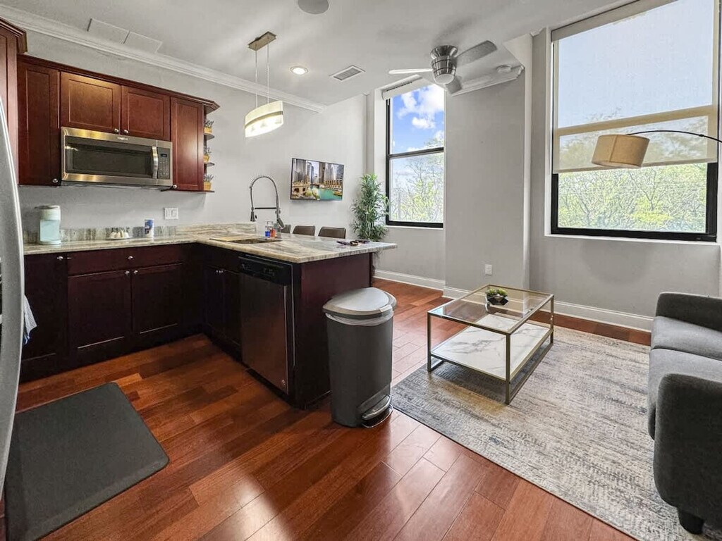 Feel at home in this charming 1-bedroom apartment nestled in a vibrant neighborhood, offering a peaceful retreat in the heart of the city. Ideal for solo travelers or couples, this apartment is close to bustling streets and historic landmarks, providing a tranquil stay while exploring Philadelphia's attractions. This inviting apartment is thoughtfully designed to cater to all your needs for a carefree and enjoyable stay. The bedroom is elegantly furnished with a queen bed, ensuring a restful night's sleep with high-quality linens, cozy pillows, and ample closet space. The living room features a stylish and comfortable sofa, seamlessly integrated into the space. The kitchen is outfitted with state-of-the-art stainless steel appliances, including a refrigerator, oven, stove, microwave, and dishwasher, making cooking and cleanup a breeze. The bathroom features a contemporary design with clean lines and high-quality finishes, creating a serene and inviting atmosphere. Pets are allowed depending on size, with a cleaning fee of $25 per night for 1-4 nights, $200 for 5-29 nights, and $300 for 30+ nights. Please inform us beforehand about bringing a pet to avoid cancellation. Note that the pool will be closed during the winter season and will reopen next summer. Experience the best of Philadelphia from this stylish urban apartment. Whether visiting for business or leisure, you'll be in the heart of the city, close to its vibrant attractions and historic landmarks. There are surveillance cameras in the hallways for security and a Minut device in the unit for noise level monitoring. No shoes are allowed in the house and guests are requested to do their dishes before leaving. Smoking is not allowed indoors, and a $500 fine will be imposed if there is evidence of smoking inside. Includes a comfortable desk and chair to ensure you can work for extended periods without discomfort. [SI]