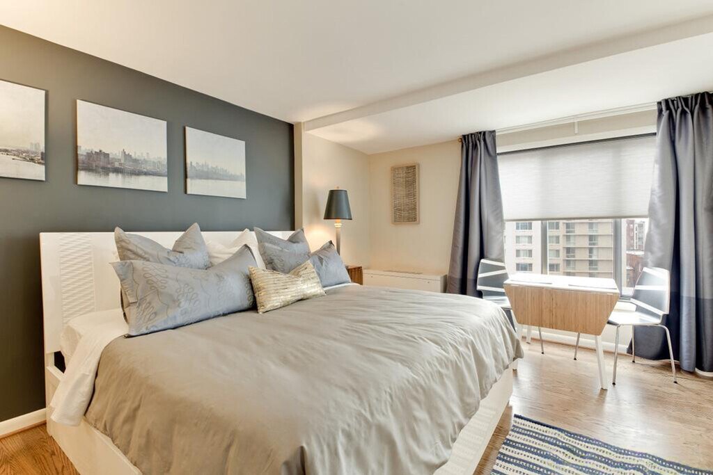 This newly renovated 9th-floor studio condo in the Logan Circle neighborhood, just one block from Dupont, offers a modern living experience. With a king-size bed, abundant natural light, hardwood floors, and comfortable furniture, this condo invites you to feel at home. The high-end kitchen features granite countertops, stainless steel appliances, and all the essential cooking tools. Residents can enjoy a rooftop pool and terrace, and benefit from a front desk with package acceptance through an on-site concierge during extended hours, along with an on-site building manager and engineer. Logan Circle is a vibrant neighborhood in the Northwest quadrant of Washington, D.C., located six blocks east of Dupont Circle. The area is known for its intersection at the traffic circle of 13th Street, P Street, Rhode Island Avenue, and Vermont Avenue, with a federal park at its center. Bordered by S Street to the north, 9th Street to the east, 16th Street to the west, and Massachusetts Avenue to the south, Logan Circle is a trendy area featuring luxury retailers like Mitchell Gold + Bob Williams, chocolatier ACKC, and upscale wine bars. [SI]