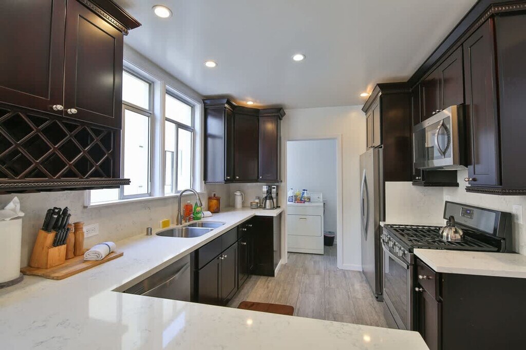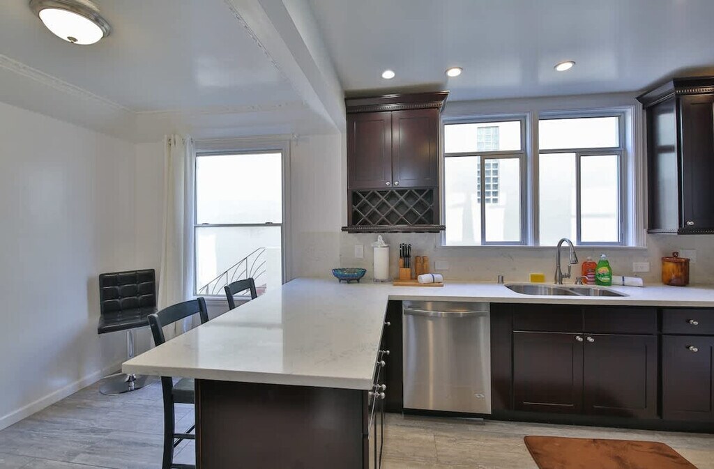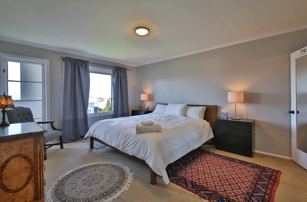 Feel at home in this centrally located, light-filled 2-bedroom, 2-bathroom apartment on the 3rd floor of a walk-up building in Inner Richmond. This apartment is flooded with natural light and can comfortably accommodate up to four guests. The kitchen is fully equipped with stainless steel appliances. The apartment also has an in-unit washer and dryer for guest use. Driveway parking is available for guests (no access to the garage). Perfectly situated in a prime, lively residential area, this apartment is near St. Mary’s Medical Center, CPMC Campus, UCSF Medical Center, and Kaiser Permanente. It's conveniently located near tons of restaurants featuring cuisines from around the world, wine bars, and neighborhood bars, and is only 3 blocks from the famous Golden Gate Park. [SI]