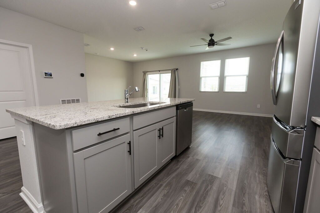 Modern Comfort with Stunning Sunset Views! Step into style with this beautifully maintained, like-new construction home featuring 3 spacious bedrooms, 2 full baths, and thoughtful upgrades throughout! Gourmet Kitchen • Granite countertops • Stainless steel appliances • Large island & pantry Bonus Flex Room – Perfect for a home office or playroom Mud Room – Extra storage and functionality Wood-Like Flooring – Sleek and durable Relax on the covered patio overlooking a peaceful pond view, perfect for catching evening sunsets. Primary Suite Highlights • His & her sinks • Walk-in closet Attached 2-Car Garage included