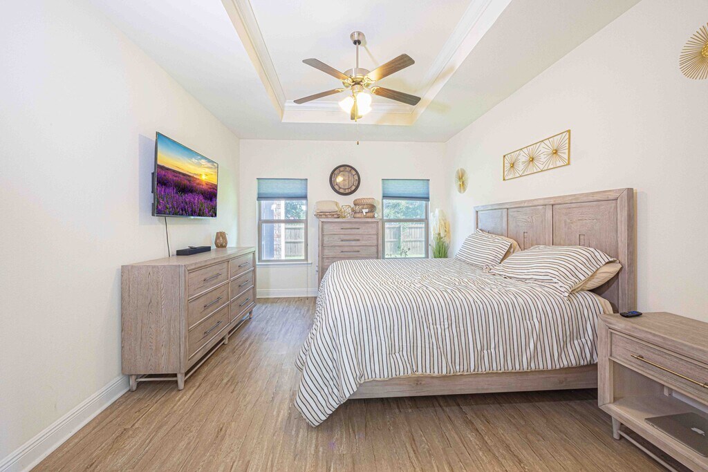 Located in the gated community of Cypress Gates,this GOLD FORTIFIED,well-maintained home features 3 bedrooms and 2bathrooms,with a layout that includes both a formal dining room and a separate breakfast area. This home is conveniently located just minutes from the beach,shopping,grocery stores,and more! The kitchen is equipped with stainless steel appliances and plenty of cabinet and counter space. The kitchen opens into the main living area. The primary bedroom features a tray ceiling with crown molding,a soaking tub,separate stand-up shower,and a walk-in closet. Split bedroom plan. There is no carpet in the home,providing a clean and low-maintenance living environment. Outside,enjoy a screened-in back porch with a ceiling fan,and a nice backyard with no rear neighbors. The laundry room leads directly into the 2-car garage for added convenience.