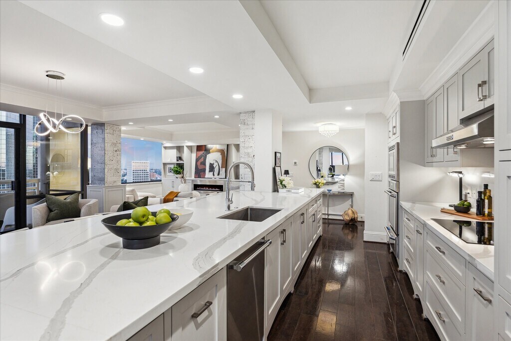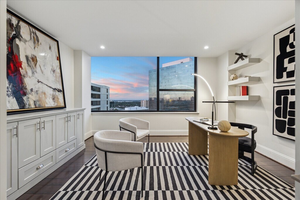 Sharlene AbgharyStunning 19th-floor corner unit offering panoramic skyline and sunset views from nearly every room. This pristine 2-bedroom, 2-bath residence has been fully remodeled from floor to ceiling. The crisp kitchen features quartz counters, marble backsplash, stainless appliances, & recent cabinetry. A beautiful granite tile entry flows into the kitchen, while wood like floors enhance the living, dining & bedrooms. The open layout provides balcony access from the living room and both bedrooms, maximizing the Amazing views. The large primary bedroom w incredible views & a spacious walk-in closet leading to a newly remodeled bath with double sinks and a separate shower with frameless-glass. The secondary bath is also fully updated w new cabinetry, counters & New Shower. Enjoy full-service high-rise living w/ valet parking, doorman, porter, 24-hour security, & a heated pool. Exceptional location near major freeways, shopping, dining, Downtown, the Texas Medical Center, & the Galleria.