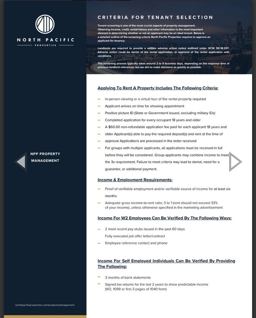 Ready for move in! Request more information to schedule a tour today! This mother-in-law unit has a sliding glass door from the living area to a private fully fenced patio area. Unit includes washer/dryer, dishwasher, refrigerator, microwave and stove. Walk-score of 83 (most errands can be accomplished on foot), nearby transit, and a 10-minute drive to downtown Seattle. Minimum 1-year lease term. $125/month utility fee to cover all utilities (except cable/internet). Pets allowed, with deposit and monthly pet rent. Maximum two pets . Cats and dogs under 50 pounds. Move in fees includes: First month's rent: $2275 Move-In Special: $1000 Off First Month's Rent Utility fee (includes water/sewer/garbage/electricity: $125 month Monthly pet rent (if applicable): $40 month Refundable Pet Deposit $500 Refundable security deposit: $2000 Resident Benefit Package $30 per month* Application fee $60-all applicants 18 and over must apply. Review the Rental criteria before applying. Application fee is nonrefundable *At North Pacific Properties, we strive to provide an experience that is cost-effective and convenient. That’s why we provide a Resident Benefits Package (RBP) to address common headaches for our renters. Our program handles insurance, air filter changes, utility set up, credit building and more at a rate of $30.00 a month, available to every eligible property upon resident election. More details upon lease agreement. Link to application and screening criteria: