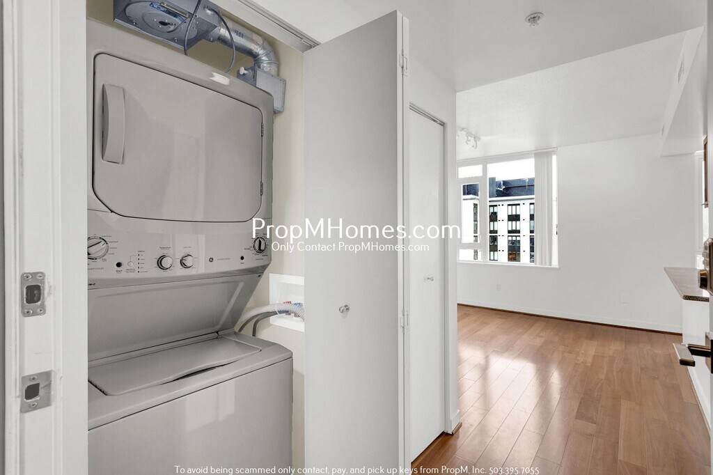 Modern east-facing 1 bed 1 bath condo in Portland's Culture District with city view. Gas, water, hot water, sewage, and garbage are included in rent. Features hardwood floors, cherry cabinets, stainless appliances, gas range, private balcony overlooking the city, and in-unit washer and dryer. The building features a common room, gym, hot tub, outdoor courtyard, bike storage and library room. Steps away from the famous Farmer's Market, PSU, Portland Art Museum, restaurants, food carts and downtown shopping. Portland Streetcar stops right across from the building can get you to Pearl, OMSI, OHSU, South Waterfront, NW as well as East Portland. Easy freeway access to Beaverton, Hillsboro for Nike, Intel, Columbia Sportswear. Parking available. First month and one month security deposit due at signing. Moving in & out fee applicable.