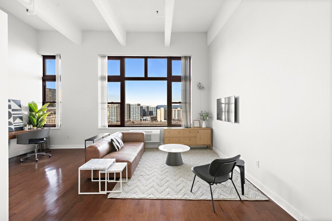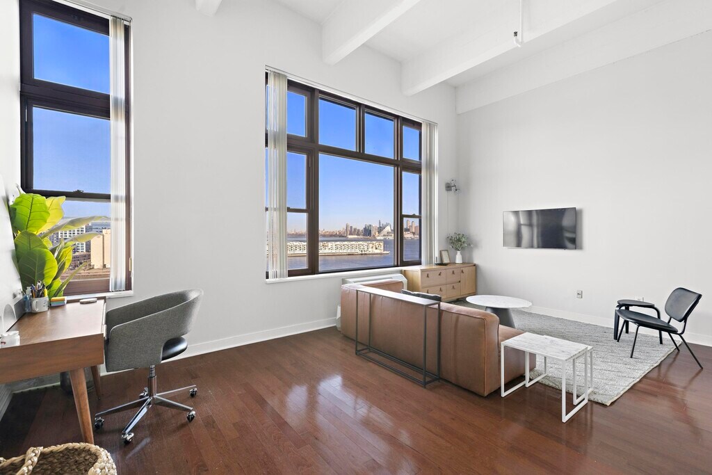 Fully furnished and ready to move in. No broker fee! Luxurious Waterfront Living in the Iconic Hudson Tea Building: Embrace the allure of this renovated corner loft, located in the renowned Hudson Tea Building. Revel in the majestic views of the Hudson River and the Palisades Cliffs. All-Inclusive Amenities: Benefit from all utilities included in this stunning residence, ensuring a hassle-free living experience. Additionally, the building offers a convenient washer-dryer facility. Spectacular Views and Natural Light: The apartment features 10-foot picture windows with custom blinds, providing panoramic views and an abundance of natural light. Spacious "D Line" Residence Layout: Enjoy nearly 1,400 sq. ft. of space, including a split layout with a welcoming entryway foyer, two bedrooms, two bathrooms, and an expansive open kitchen, living, and dining area. Gourmet Chef's Kitchen: The open-concept kitchen is equipped with a large center island, breakfast bar, top-tier stainless steel appliances, granite countertops, and ample cabinet space. Opulent Bedrooms and Spa-Like Bathrooms: The primary suite includes three custom-organized closets and an ensuite bath with an oversized shower. Both bathrooms feature marble finishes and stylish vanities. Additional Features for Comfort and Convenience: This loft boasts a full-sized, in-unit laundry, built-in linen closet, coat closet, 4" natural hardwood floors, ceiling fans, and elegant lighting fixtures. Comprehensive Building Facilities: Access to a gym, a WeWork-like area, a lounge, and a dedicated children's play area. Garage parking available across the street. Prime Location and Easy Commute: Just minutes to Times Square via public transport, bus, subway, or ferry, offering the perfect blend of tranquil waterfront living and city accessibility.