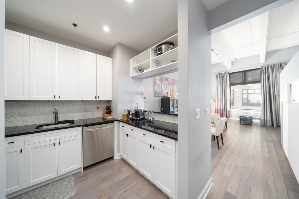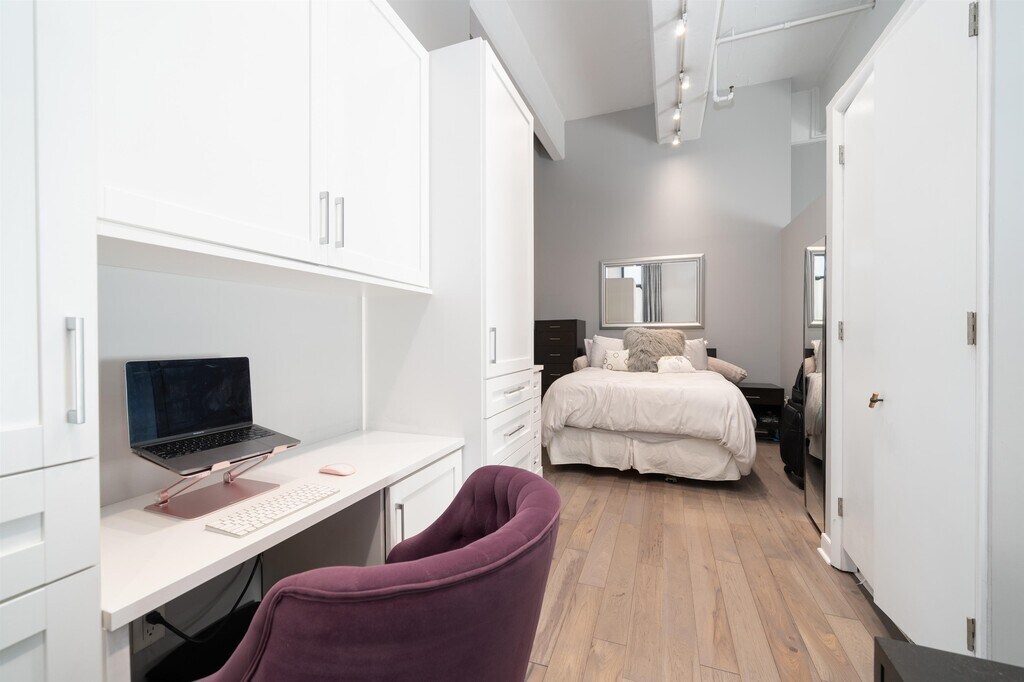 Welcome to this spacious, sun-drenched studio loft with soaring 14' ceilings and dramatic 10' picture windows offering a stunning Southern exposure. This thoughtfully designed space features a sleeping alcove, beautiful custom-built wall unit with a work space and added storage outfitted with specialty organizers and has been fully upgraded with new high-end wood flooring throughout. Custom room-darkening shades and blackout curtains ensure privacy and comfort at any time of day. The open-concept kitchen boasts a beautiful mosaic glass tile backsplash, upgraded cabinets with sleek matte black hardware, and high-end stainless steel appliances. The layout flows seamlessly into dedicated dining and living areas, perfect for both relaxation and entertaining. The bathroom, finished with classic black and white tiles, offers plenty of space for additional storage and the convenience of in-unit laundry. Premium parking spot is included! Statuesquely situated along the edge of Hudson River overlooking New York City, The Hudson Tea Buildings is an iconic, meticulously maintained community that offers unmatched access to all forms of transportation, the Hudson River Waterfront Walkway, and everything that makes Hoboken and New York City so special. In addition to a 24-hour concierge and a dedicated, skilled service staff, the Hudson Tea offers a full suite of luxe amenities including a nearly 3000 sqft gym with Pelotons and included fitness classes, stunning resident's lounge with private dining room w/NYC views, a new free WFH space, new kid's playroom, 3 high-speed elevators, free shuttle to/from PATH, dry cleaner, Choc O Pain French cafe onsite, and resident's courtyard with fire pit perfect for alfresco dining. Additional amenities include bike & add'l on site resident's storage. Located within proximity to neighboring Harborside & Maxwell Parks, boutique shopping, outdoor eateries, Soul Cycle, Pilates, spas, wine shops, and easy access to transportation including the Direct 14th St Ferry to Midtown & WFC. With Trader Joe's, Whole Foods, farmer's market, and Urban Market groceries, every convenience is at your doorstep.