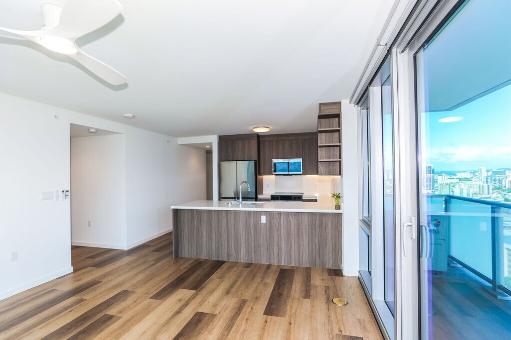 Experience modern luxury livings in the heart of Honolulu. Perched on a high floor, this brand new two-bedroom, two-bath residence showcases breathtaking partial ocean, mountain, and city views and awaits its new tenants.