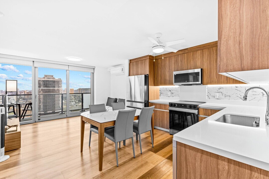 Beautiful 2-bedroom, 2-bath corner-unit condo located in the newly developed Park at Keeaumoku. This modern residence features an open-concept kitchen that flows seamlessly into a spacious living area, extending to a wrap-around lanai with breathtaking ocean and city views. The unit features an in-unit washer and dryer, quartz countertops, upgraded vinyl flooring, and excellent cross breeze for added comfort. Residents can enjoy a variety of resort-style amenities, including an infinity pool and spa, BBQ pavilions, fitness center, sauna, theater room, and clubrooms. Ideally located near Ala Moana Shopping Center, Sam’s Club, Walmart, Waikiki, and a wide selection of dining options. No pets and no smoking. Tenant pays for electricity. Available May 1, 2026.