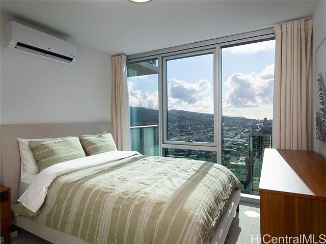 Special price$3800 plus Electric for the renter who starts from in December. Basic price $3800 plus tax. Open-concept living and dining area with floor-to-ceiling windows for abundant natural light.City skyline views with plenty of natural light. Flooring with a warm tone. Modern kitchen featuring stainless steel appliances, quartz countertops, and a large island New motaraized roller shade has been installed. Master suite with ensuite bathroom and walk-in closet Second bedroom with easy access to a full bathroom In-unit washer/dryer and ample storage throughout Island-style lanai (163 sq ft) offering views of the city, the distant sea, and surrounding mountains Private balcony space ideal for coffee or sunset relaxation High-speed internet available. Split air conditioning and energy-efficient lighting Secure entry and 2 assigned parking stalls Excellent HOA to downtown and beaches Ideal for responsible renters seeking a comfortable urban lifestyle Flexible leasing options available; inquire about move-in ready timelines. Comprehensive building amenities. Roller shades have been installed.