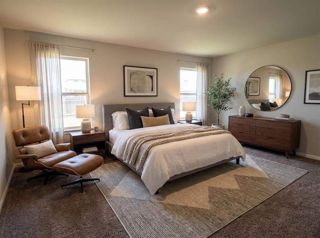 Beautiful 4-bedroom home in the desirable Whisper subdivision! This spacious layout features 2 bedrooms on the main level including the primary suite, plus 2 bedrooms and a large bonus room upstairs. Bright open-concept living with a well-appointed kitchen, pantry, and a large walk-in laundry room. Enjoy a large covered back patio overlooking a big fenced yard with no direct back neighbors—perfect for privacy and sunsets. Property includes a long driveway and a 2-car garage. Located just seconds from I-35 for easy access to San Marcos, Kyle, Austin, and San Antonio. Fridge, washer and dryer convey.