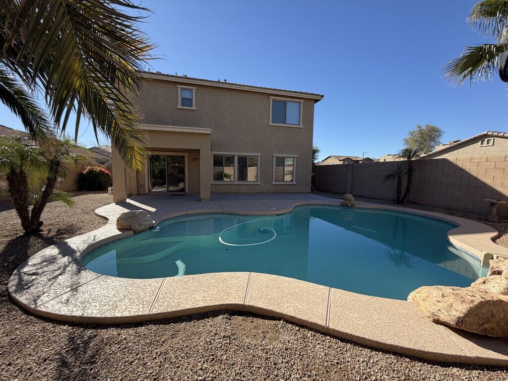 Beautiful 4-Bedroom Home with Private Pool Landscaping & Pool Service Included Beautifully updated 4 bedroom, 3 bathroom home offering approximately 2,530 square feet with a well-designed open floor plan, private backyard, and refreshing swimming pool with rock waterfall feature. The newly remodeled main level features ceramic tile throughout, granite countertops, new stainless steel appliances, updated cabinetry, and a spacious, open living area ideal for everyday living and entertaining. The second level includes an oversized loft/bonus room, a generous Primary Bedroom with double-door entry, two walk-in closets, and an ensuite bathroom with separate shower, soaking tub, and double sinks. A conveniently located upstairs laundry room includes washer and dryer. A 4th bedroom on the main level offers flexibility for use as a bedroom, office, workout room, or additional living space. The main-floor bathroom includes a bonus shower, making the layout ideal for guests or multi-generational living. The private backyard is designed for relaxation, featuring a swimming pool with waterfall, while monthly landscaping, pool maintenance, and HOA fees are included in rent. Conveniently located near dining, shopping, and everyday amenities. Rental Requirements: Maximum occupancy: 5 residents All occupants age 18 and over must submit an application Minimum credit score: 600 for all adult applicants Verifiable income required Pets: Maximum of 2 (breed/weight restrictions and pet fees apply) Background and rental history screening required