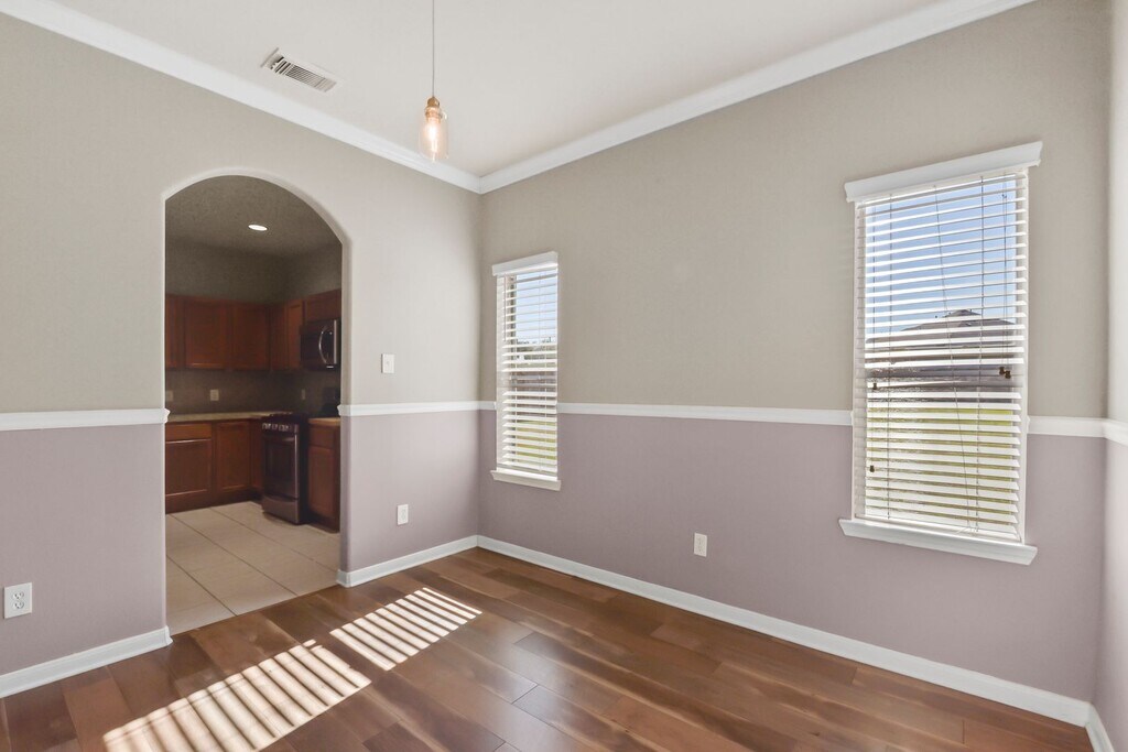 Welcome to this beautiful two story townhome featuring three bedrooms and two and a half baths with an open concept layout designed for modern living. The kitchen seamlessly connects to the dining and spacious family room,highlighted by elegant laminate flooring throughout the main living areas and stairs. Enjoy crown molding accents in the entry and dining area along with a kitchen pass through bar overlooking the family room,perfect for entertaining. The kitchen also includes a stainless steel gas stove,microwave,dishwasher,and a convenient pantry for storage. Relax in the oversized owner’s suite measuring twenty feet by nineteen feet featuring space for a sitting area or home office,plus a large walk in closet and additional linen closet. Step outside to a new backyard deck with no rear neighbors and only one side neighbor,offering privacy and peace. MLS# 45968693