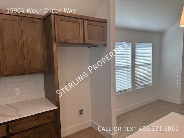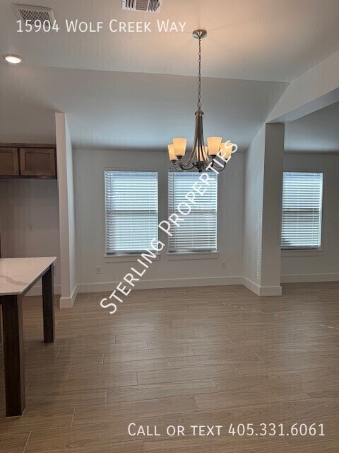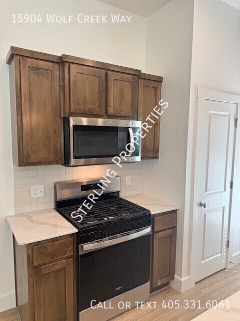 BRAND NEW ENERGY EFFICIENT CONSTRUCTION in the Native Plains community in SWOKC. Moore school district. Open floor design with wood look tile throughout the main living areas. Carpet in the 3 bedrooms complete with ceiling fans. Master suite to the back of the home with double vanity, separate garden tub, tile shower and large walk in closet. Secondary bedrooms to the front of the home with a mud bench in the hallway to the garage entry. Utility room adjacent to the master. Kitchen features stainless steel gas range with built in microwave, pantry, single tub kitchen sink with window overlooking the backyard. Kitchen island provides great prep space flowing into the dining and living space. Covered back patio with fenced yard, pet friendly with additional refundable pet deposit. 2 Bathrooms 2 Car Garage 3 Bedrooms Central Heat & Air Covered Patio Gas Stove Kitchen Island Open Plan Washer & Dryer Hook Ups