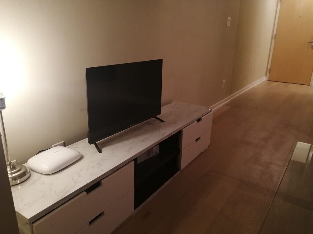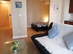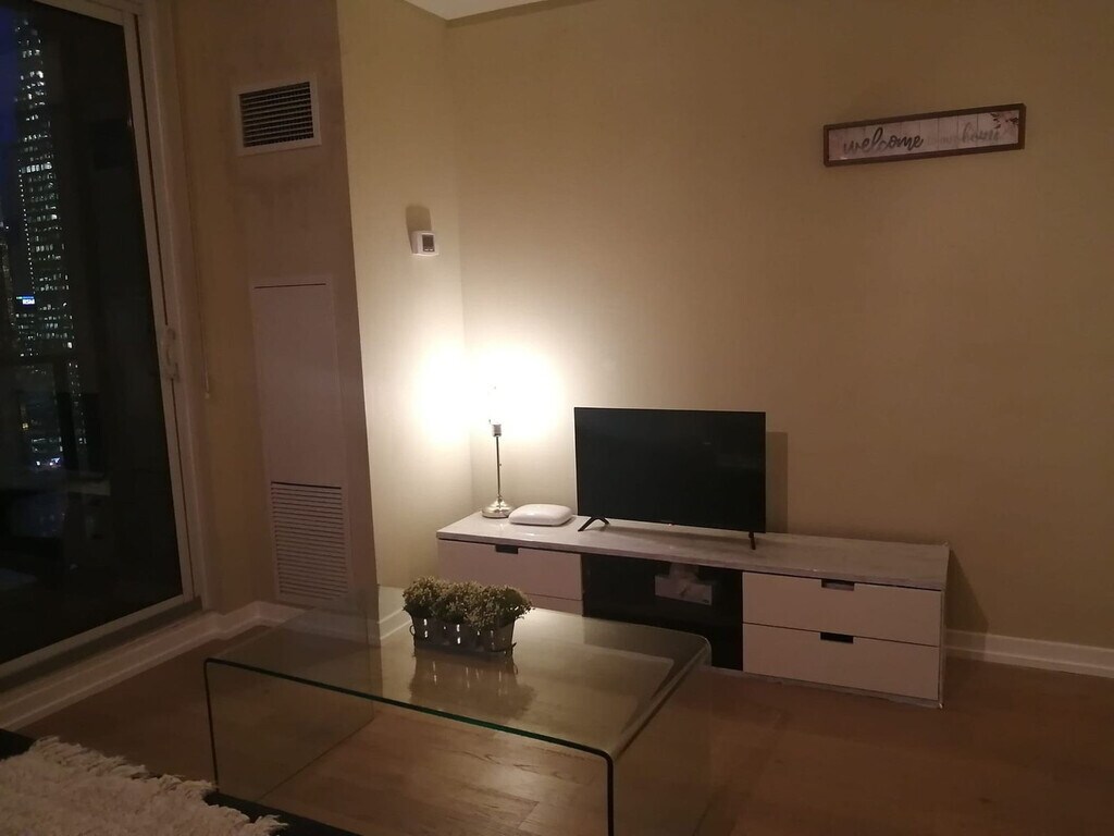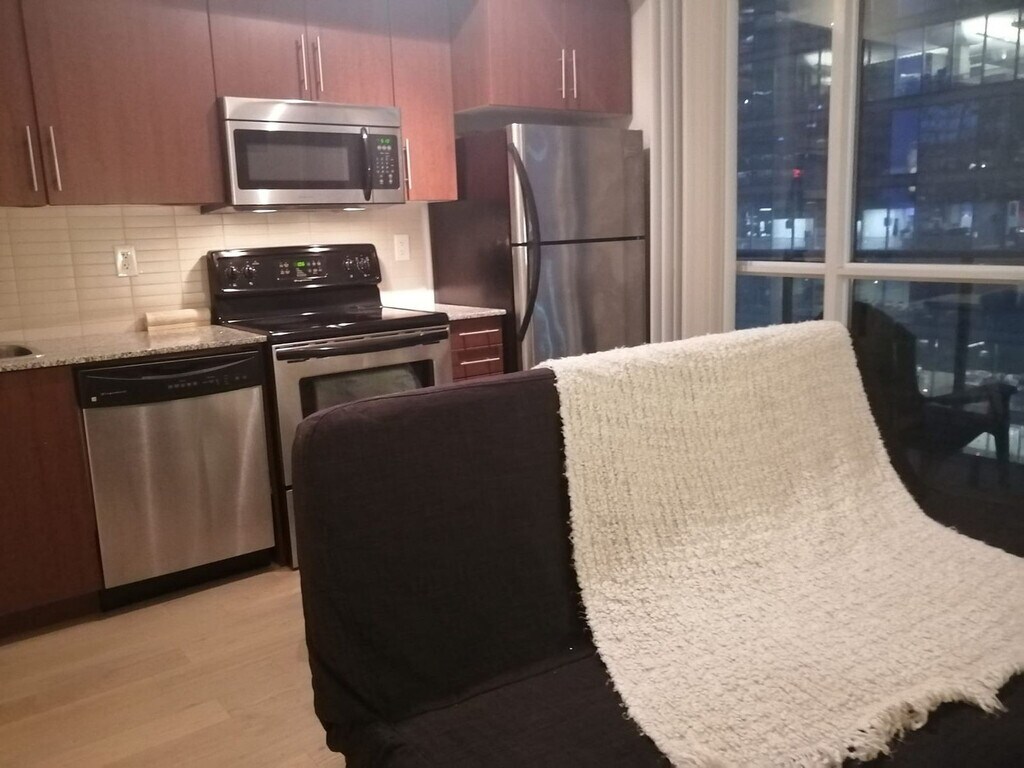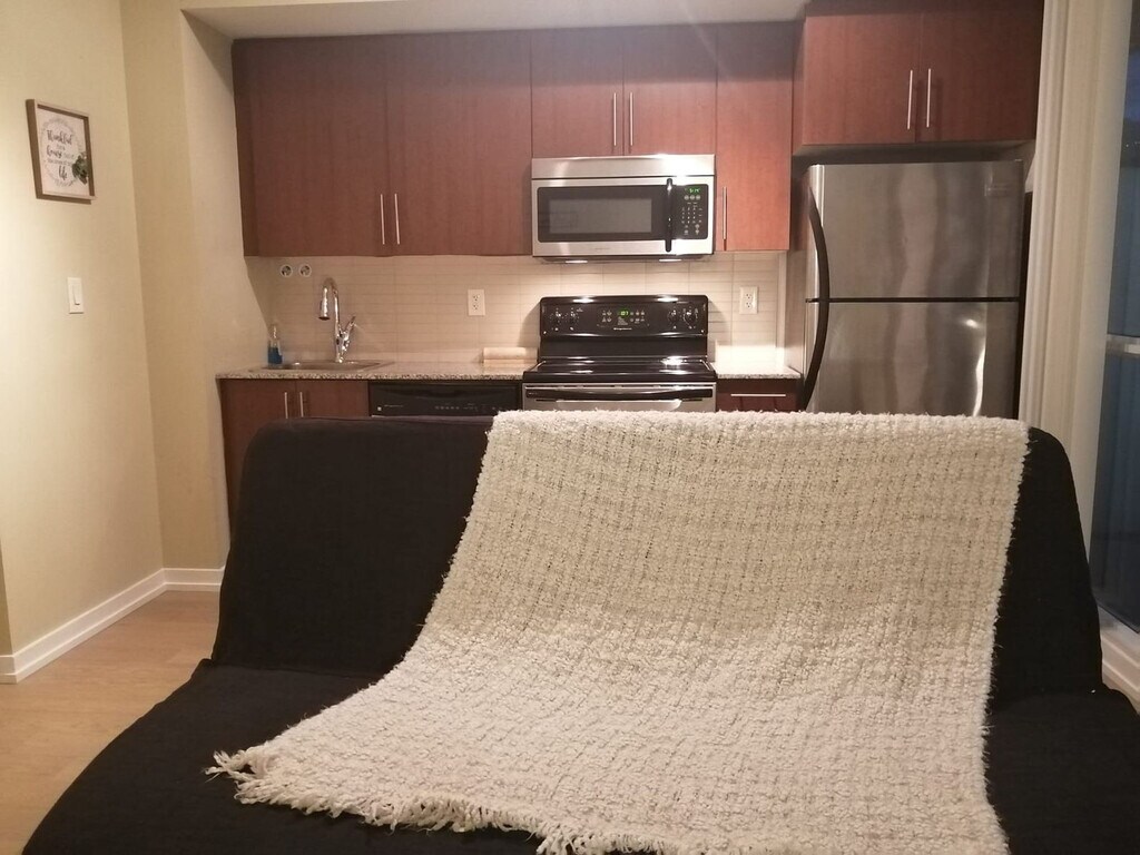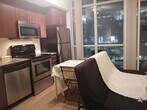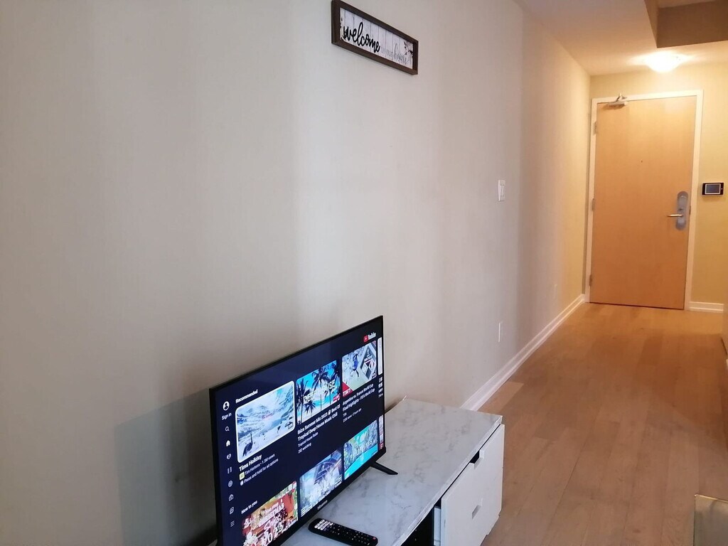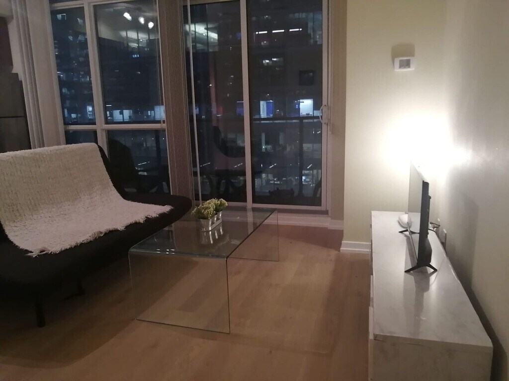 Feel at home in this beautiful, large 1-bedroom condo apartment, offering ample space and a great view of the CN Tower and ScotiaBank Arena's main entrance. This apartment comes with a fully equipped kitchen and an in-suite washer and dryer. Ample room is available for clothing storage in the walk-in closet. The unit has many windows equipped with manual blinds and shades. The floor is wooden, so it is very comfy and warm. This apartment is centrally located. [SI]