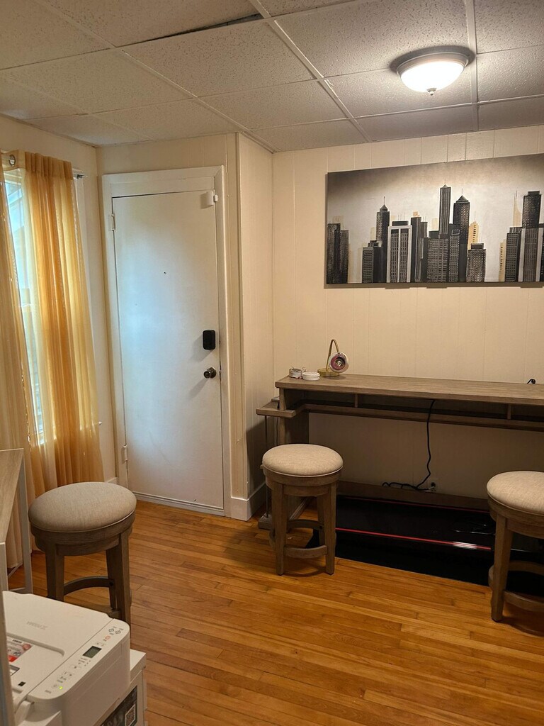 Feel at home in this beautifully remodeled and furnished 2-bedroom, 1-bathroom apartment in the walkable Historic Eastwood neighborhood of Syracuse. This apartment features a large living room area with a large sectional recliner and a 65-inch wall-mounted television, a separate eating area, and a fully equipped kitchen with a stove, refrigerator, microwave, toaster, coffee maker, and Ninja smoothie maker. There is also a huge backyard with furnishings and a covered area, and hardwood flooring throughout. This apartment is centrally located and close to Upstate Hospital, Syracuse University, Destiny USA Mall, and Downtown Syracuse. It is a 3-minute walk to Walgreens and a 5-minute walk from the bus stop. The neighborhood is quiet, safe, and walkable, with an event center on the corner and conveniently located stores within a 5- to 10-minute walk. Quiet hours are between 9:00 PM and 7:00 AM. Includes a separate large space equipped with a printer and a work desk. [SI]