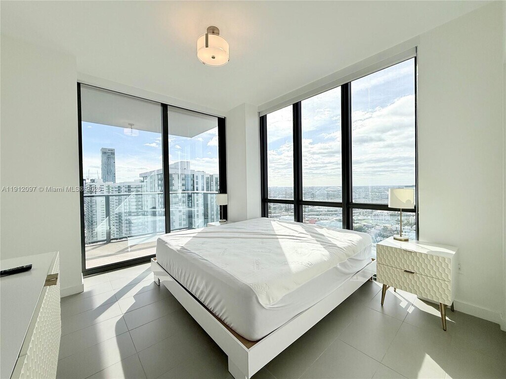 Gorgeous high-floor corner unit – 2 bedrooms, 2 bathrooms, fully furnished and move-in ready. Enjoy stunning city and water views from a spacious layout in a prime location—just 15 minutes from Brickell, Miami Beach, and the airport, plus steps from Wynwood and Midtown. This is the highest floor corner unit available in the building! The building offers 30,000 sq. ft. of amenities: 3 pools, Jacuzzi, state-of-the-art gym, sauna & treatment room, yoga studio, racquetball court, theater, social room, business center, and more. Basic WiFi and cable are included. Comes with 2 parking spots (one garage + one valet).