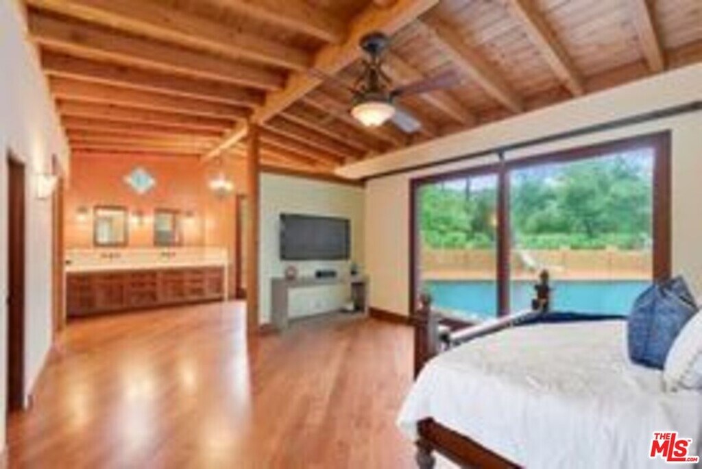Nestled in the exclusive Royal Woods neighborhood of Sherman Oaks, this beautifully reimagined 4-bedroom, 5-bath Spanish-style home offers privacy, character, and exceptional indoor-outdoor flow. Located south of Ventura Blvd, the residence showcases warm luxury with vaulted ceilings, rich woodwork, and an open layout ideal for entertaining.The chef's kitchen features custom cabinetry, high-end appliances, a spacious pantry, and a pass-through window to the patio for effortless alfresco dining. French doors open to a lush, private backyard oasis with mature landscaping, built-in seating, fire pit, and a solar-heated triangle pool with peaceful canyon views. The primary suite is a true retreat with cedar vaulted ceilings, Brazilian cherry floors, a massive walk-in closet, steam shower, and a spa-like bath with jetted tub and bidet. There are two spacious guest bedrooms, a fourth bedroom near a separate entrance, and a light-filled bonus room that could serve as a fifth bedroom all within a flexible layout offering ample space for both relaxation and entertaining. An attached garage, generous storage, and charming architectural details throughout complete this special offering. A rare and soulful home built for both comfort and inspiration. MLS# 25606093
