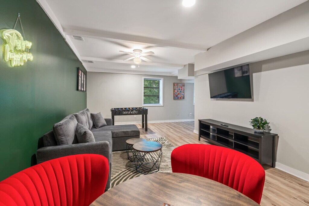 The advertised rate of $8,126/month is the lowest available price, based on a 1 month(s) stay with a move-in date of April 6, 2026. Rates vary depending on the duration of stay, season, and other parameters. For exact pricing and additional pricing components, please visit our website and enter your desired move-in and move-out dates. The rate is applicable when billed upfront; it can be higher if billed in multiple payments. Experience spacious living and feel at home in this 4-bedroom, 3-bath retreat, offering 3,000 sq ft of space on 1.5 private acres. Designed for gatherings big or small, this home offers flexible sleeping arrangements and multiple living spaces, both indoors and out. This home features a main living room with plush seating and a Smart TV, a game room with pool and foosball tables, and a fully stocked kitchen with stainless appliances, cookware, and a coffee maker. There is also a large dining area with an open layout for easy flow between cooking, eating, and lounging. Step outside to your private, fully fenced, tree-lined yard, which features a spacious deck, fire pit, and plenty of seating. Pet-friendly amenities are available with an additional cleaning fee per pet: $200 for 1–4 nights, $300 for 5–14 nights, $400 for 15–25 nights, and $450 for 25+ nights. Child and infant amenities are available upon request at least 72 hours before arrival. Close to Truist Park and popular attractions, this home is 10 minutes from Truist Park & The Battery Atlanta, and 20–25 minutes from State Farm Arena & Mercedes-Benz Stadium, Georgia World Congress Center, Georgia Aquarium, World of Coca-Cola, Centennial Olympic Park, and Zoo Atlanta. The home is also near Smyrna Market Village & Village Green, Marietta Square, Mason Mill Park and the Silver Comet Trail. Cats are not allowed. Smoking indoors is prohibited and will result in a $1000 fine. Parties and social gatherings are not permitted, and any group found to be deceitful will incur a $1000 surcharge. An undeclared guest surcharge of $100 per night will be applied for each unapproved guest. Evidence of unregistered pets will result in a $250 fine. A fee of $30/hour will be applied for any late check-out or early check-in requests, but is subject to approval. High-speed Wi-Fi and a dedicated workspace are available. [SI]